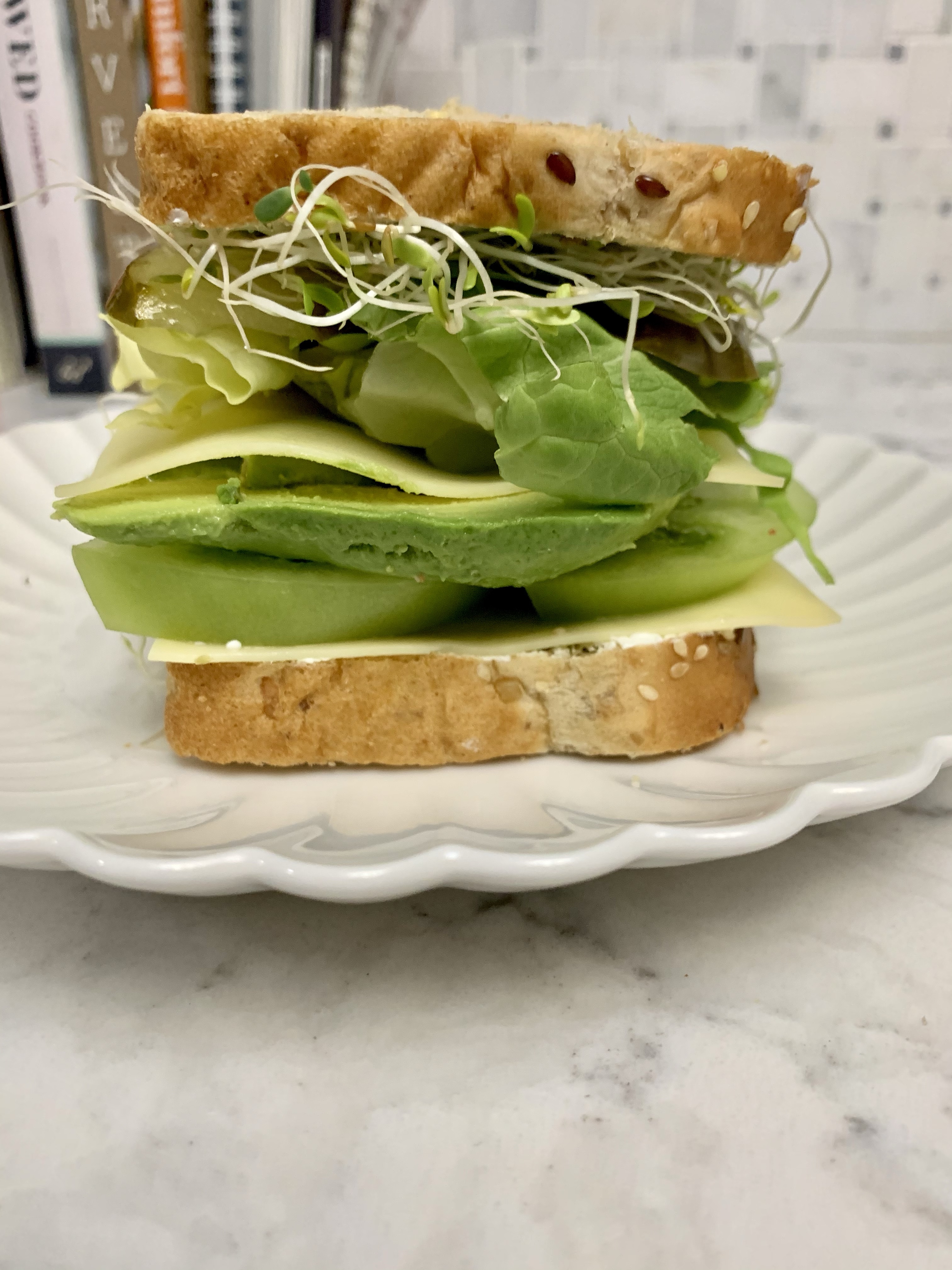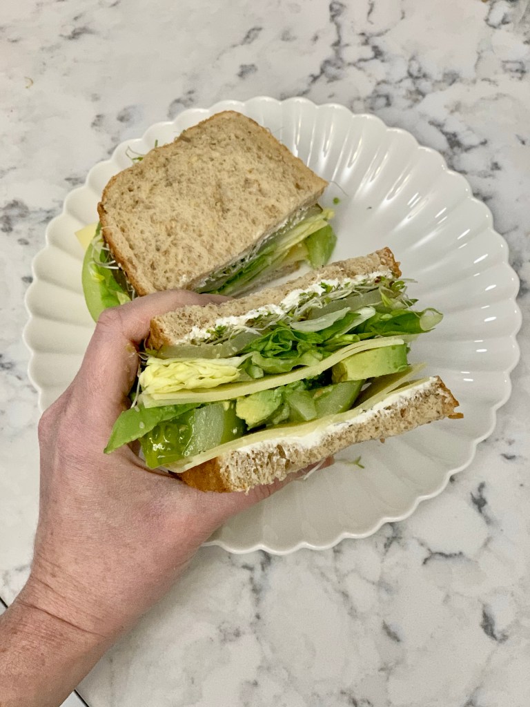 I blame a blogger. I was scrolling through my blog feed and was fully inspired by Natalie’s recent meals. She made a veggie sandwich that just looked absolutely delicious. I made a plan to make my own version the very next day. I should note, this is rare for me. A sandwich without meat (or at least falafel) doesn’t really feel like a sandwich, but this was absolutely incredible. There are a lot of ingredients but very little prep involved so this comes together quickly. I also love how it looks with everything being green. Sure, you could use regular tomatoes, but the firmness of green ones (or at least heirloom ones) are so much better. When it comes to tomatoes, if they don’t practically crunch, I don’t want em.