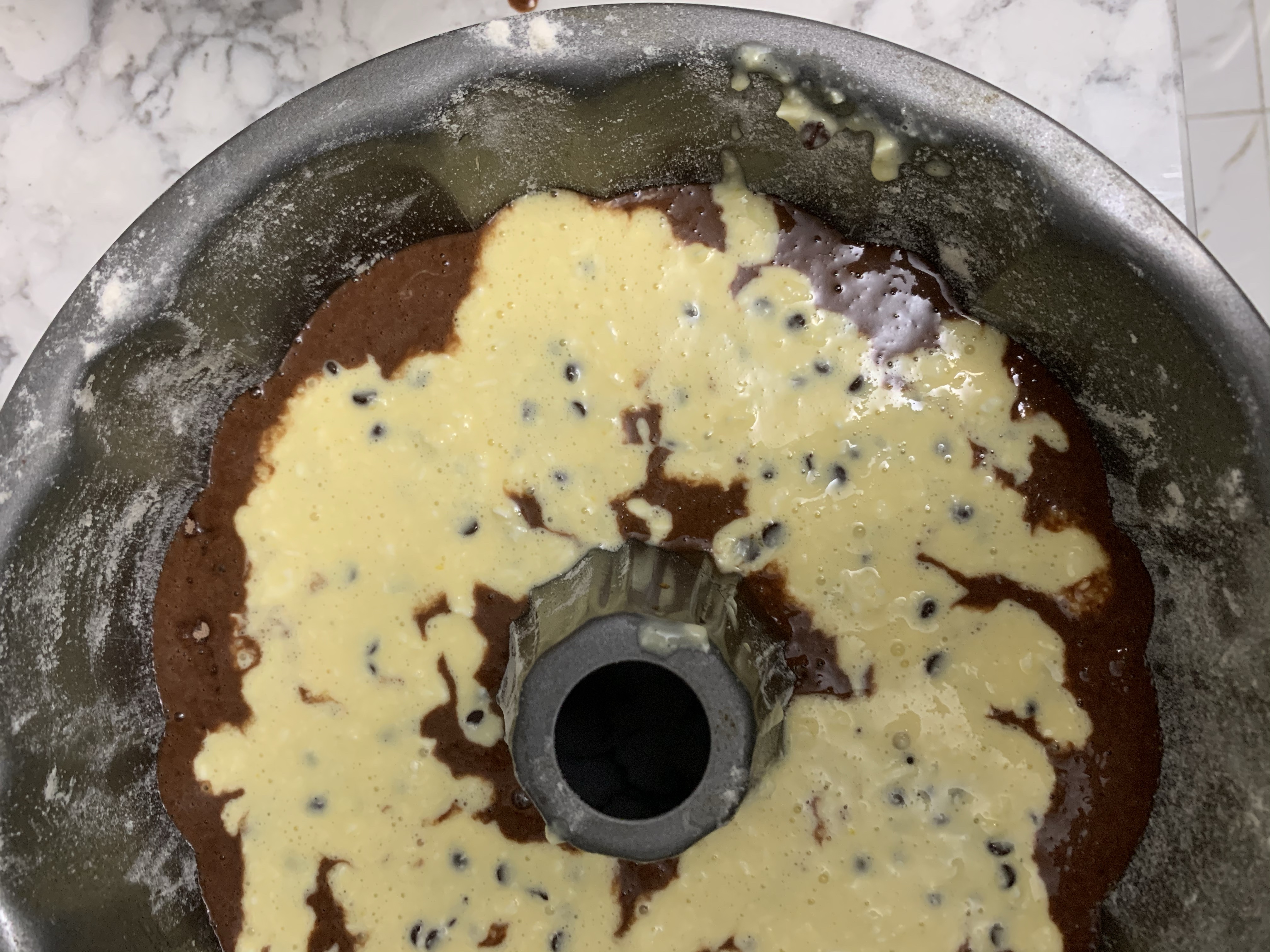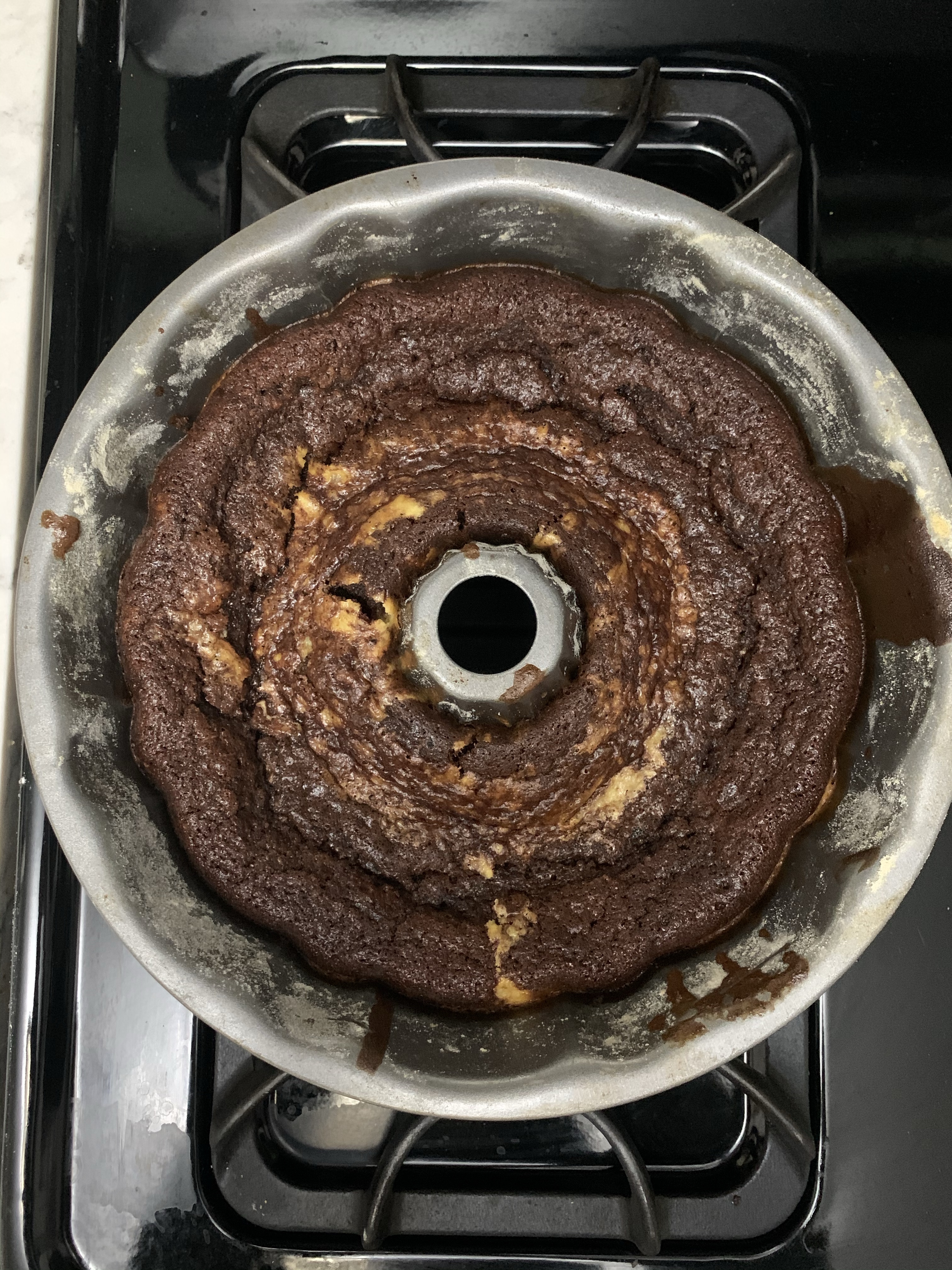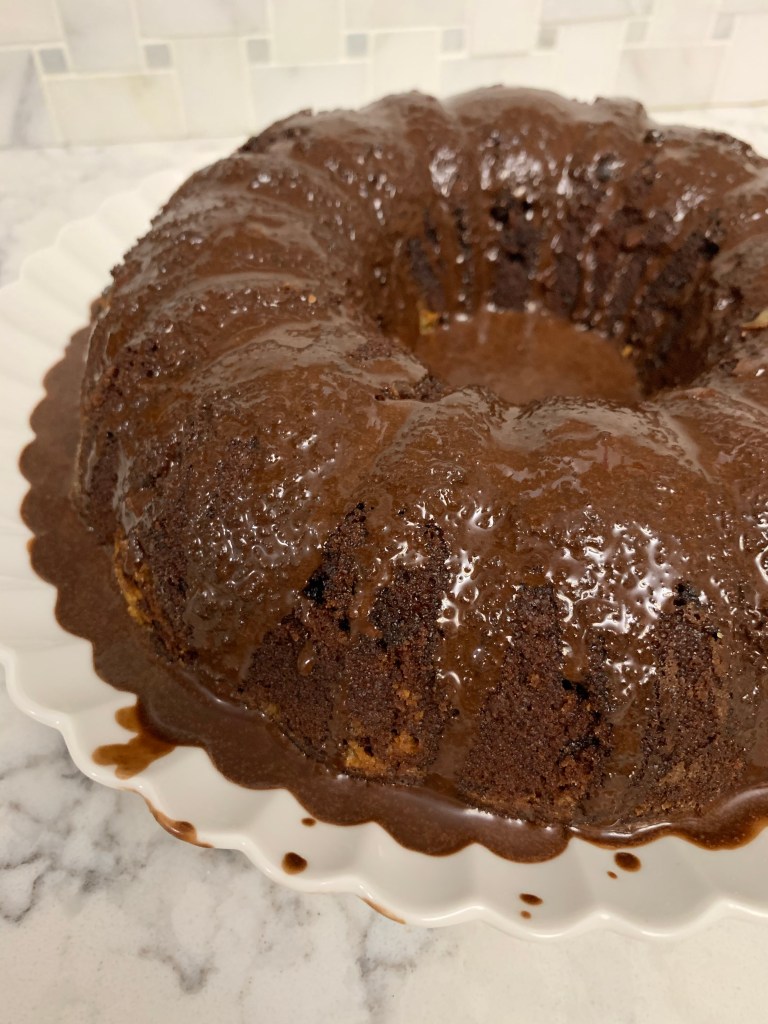 Preheat oven to 350 degrees and grease and flour a bundt pan. First, make the main cake batter. Mix 1 box of chocolate cake mix with 1 1/4 c. water, 1/2 c. vegetable oil, 1/2 c. sour cream, and 3 eggs. This can easily be mixed by hand til there’s no dry bits of cake mix. In a separate bowl, combine 8 oz softened cream cheese with 1 egg, 1/4 c. sugar, 1 tsp vanilla extract, and 1/2 c. chocolate chips. Pour 3/4 of the cake batter into the pan, spoon the cream cheese mixture over that, and pour the remainder of the cake batter. Bake for 50 minutes or until it passes the toothpick test. Let it cool for a bit before turning it out onto a plate. Once it cools completely, take a can of chocolate frosting and warm it up in the microwave (only about 25 seconds). Pour it over the cake for extra indulgence.