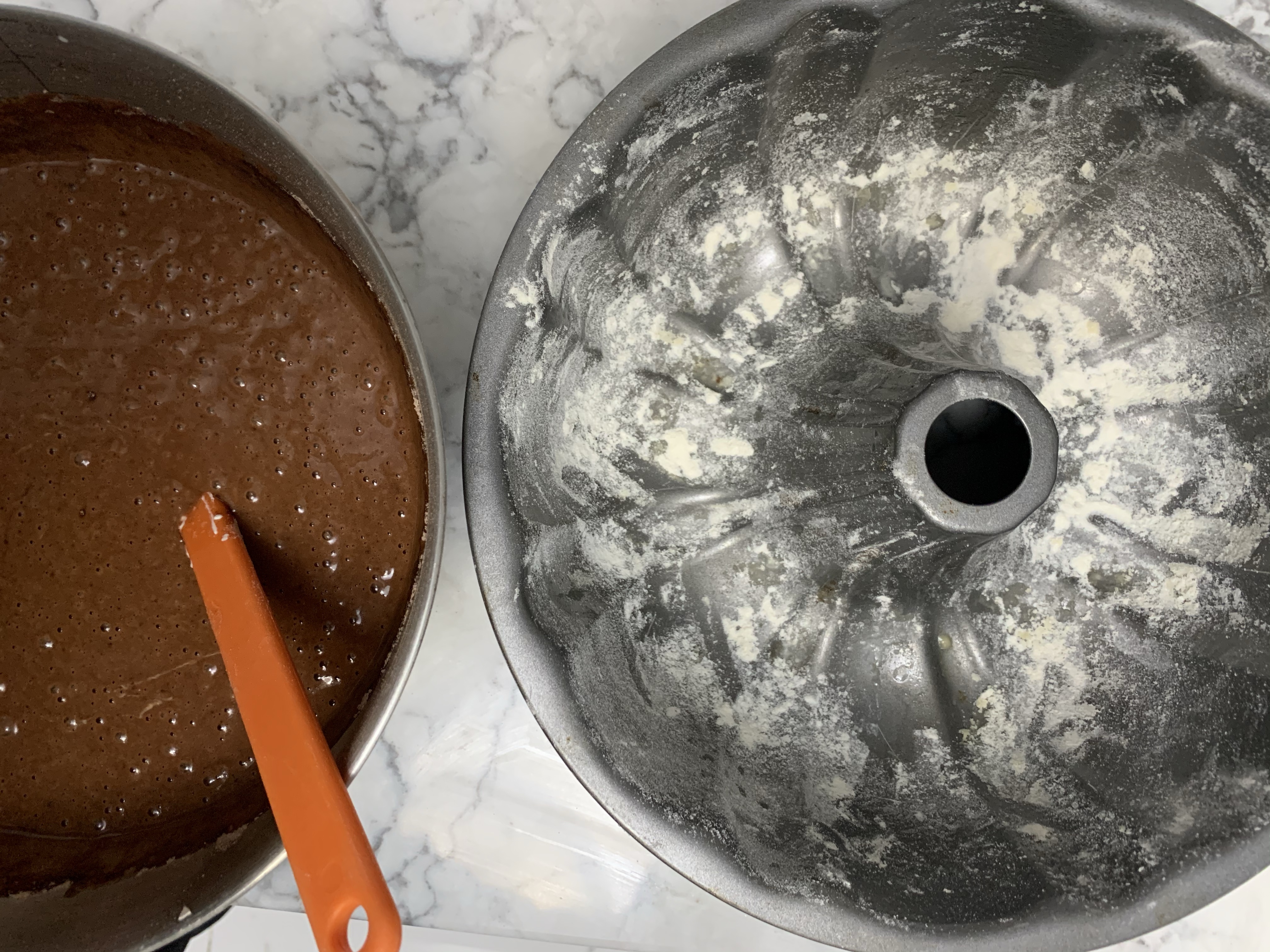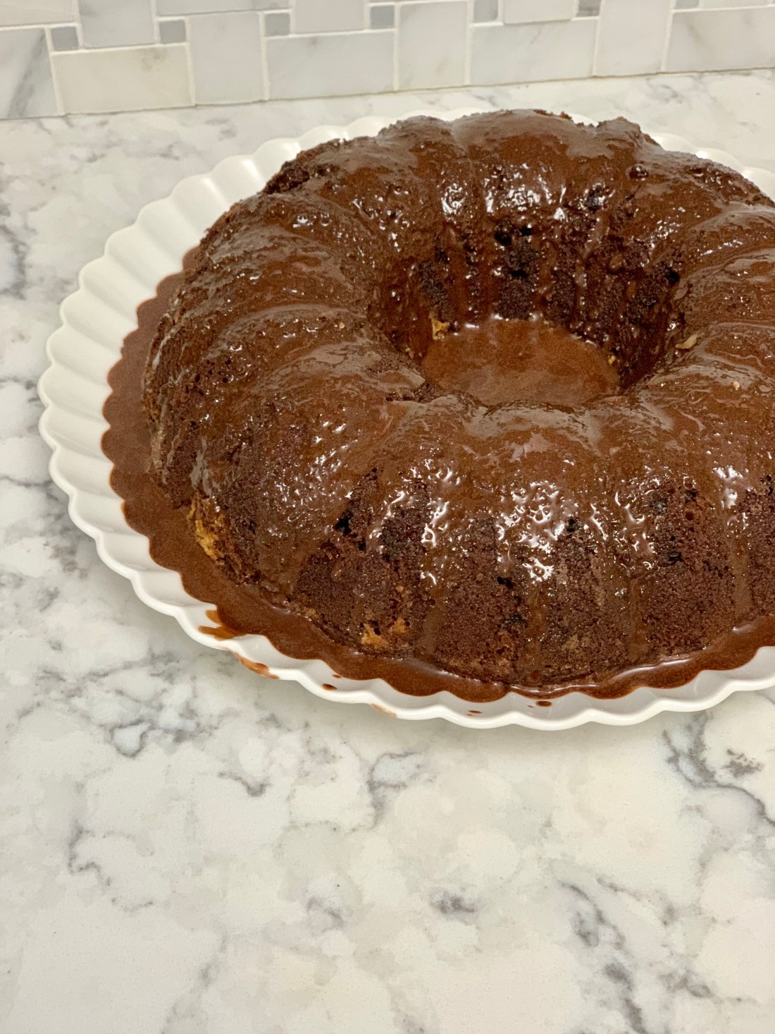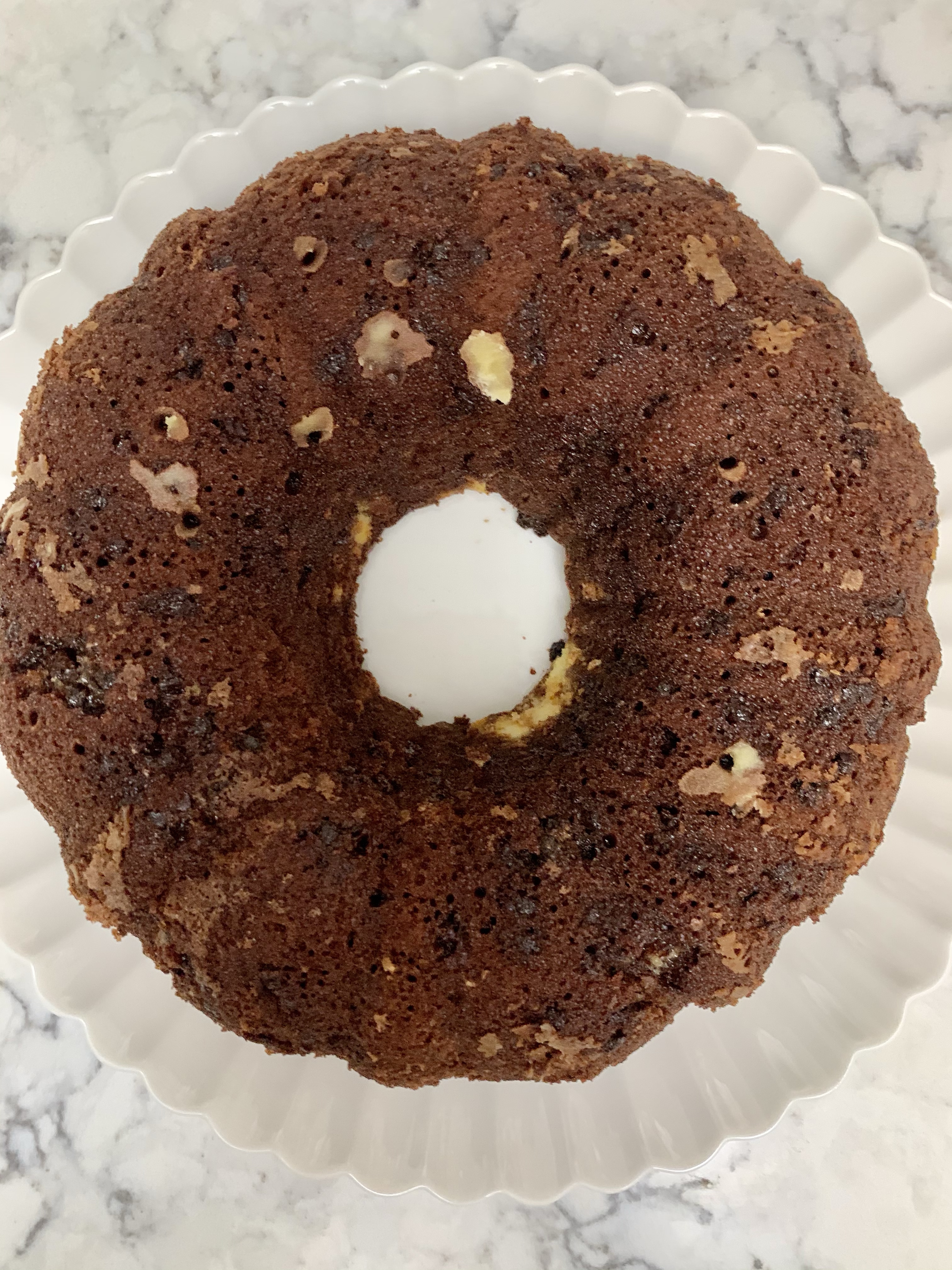 Preheat oven to 350 degrees and grease and flour a bundt pan. First, make the main cake batter. Mix 1 box of chocolate cake mix with 1 1/4 c. water, 1/2 c. vegetable oil, 1/2 c. sour cream, and 3 eggs. This can easily be mixed by hand til there’s no dry bits of cake mix. In a separate bowl, combine 8 oz softened cream cheese with 1 egg, 1/4 c. sugar, 1 tsp vanilla extract, and 1/2 c. chocolate chips. Pour 3/4 of the cake batter into the pan, spoon the cream cheese mixture over that, and pour the remainder of the cake batter. Bake for 50 minutes or until it passes the toothpick test. Let it cool for a bit before turning it out onto a plate. Once it cools completely, take a can of chocolate frosting and warm it up in the microwave (only about 25 seconds). Pour it over the cake for extra indulgence.