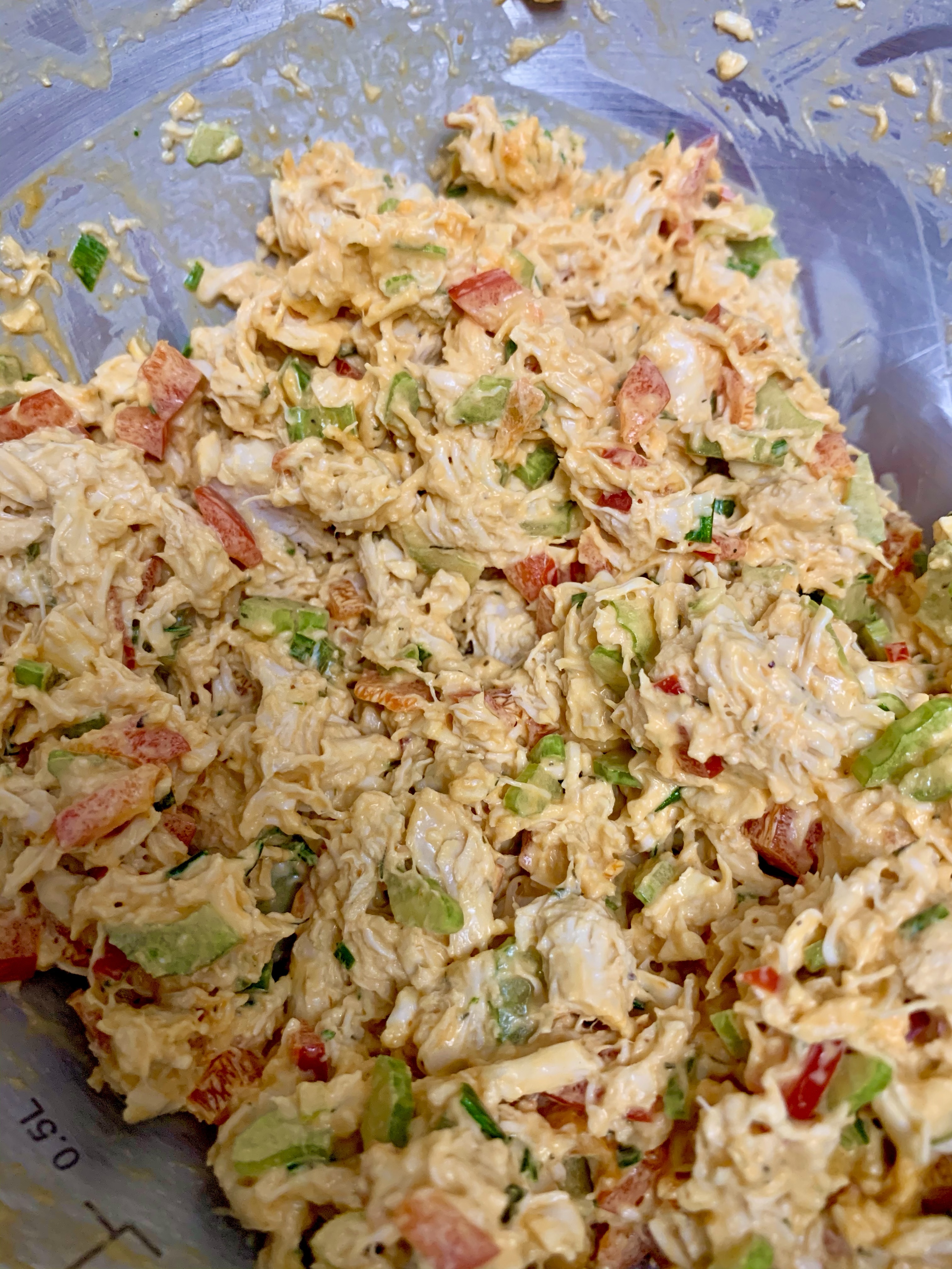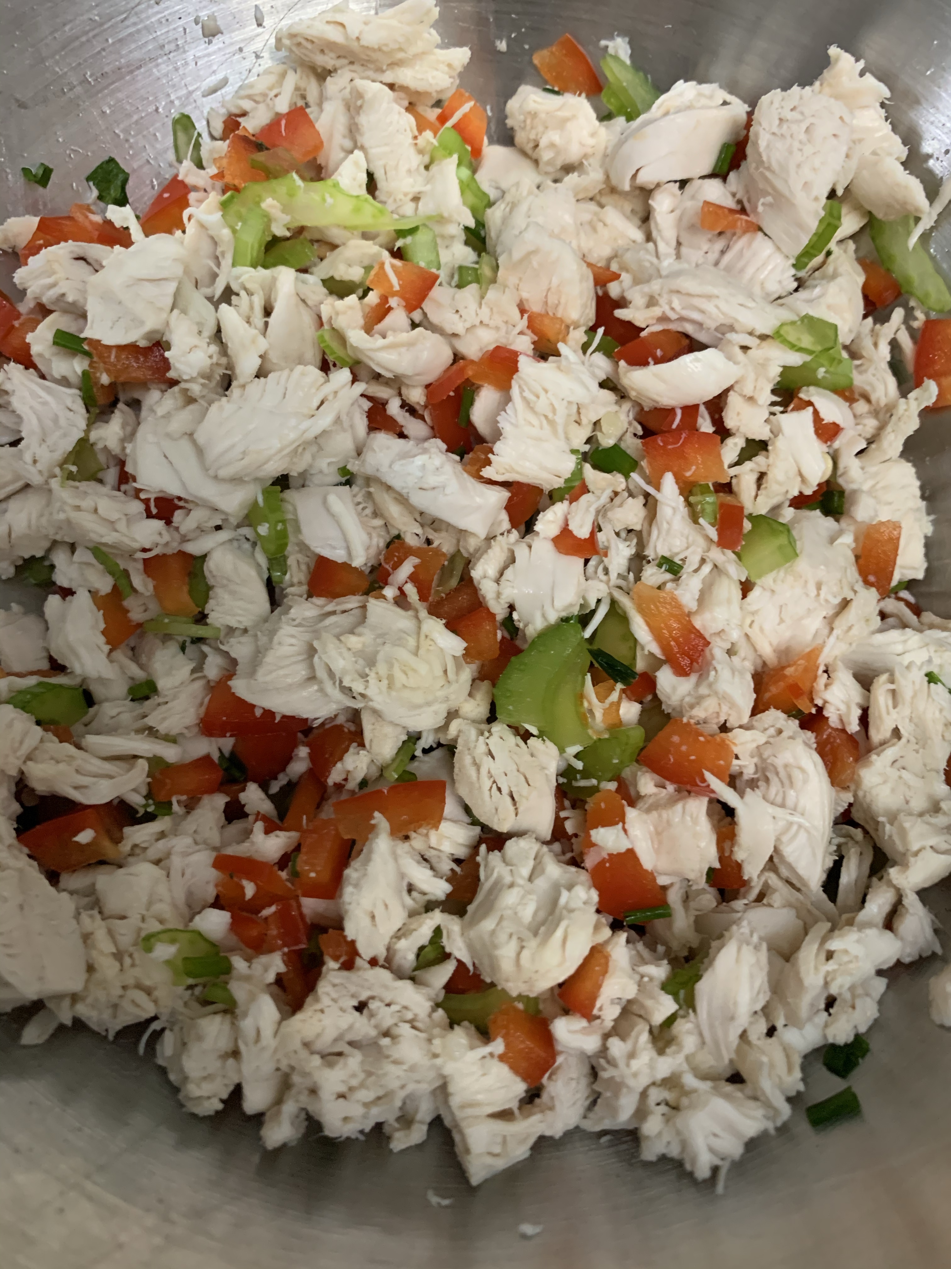 - The measurements for all this will depend on how much chicken you have. I had 7 chicken tenders and used two celery stalks, 1/2 a bell pepper, and less than 1/2 a container of yogurt (and eyeballed the same amount of mayo). This made enough for 2 very generous servings.