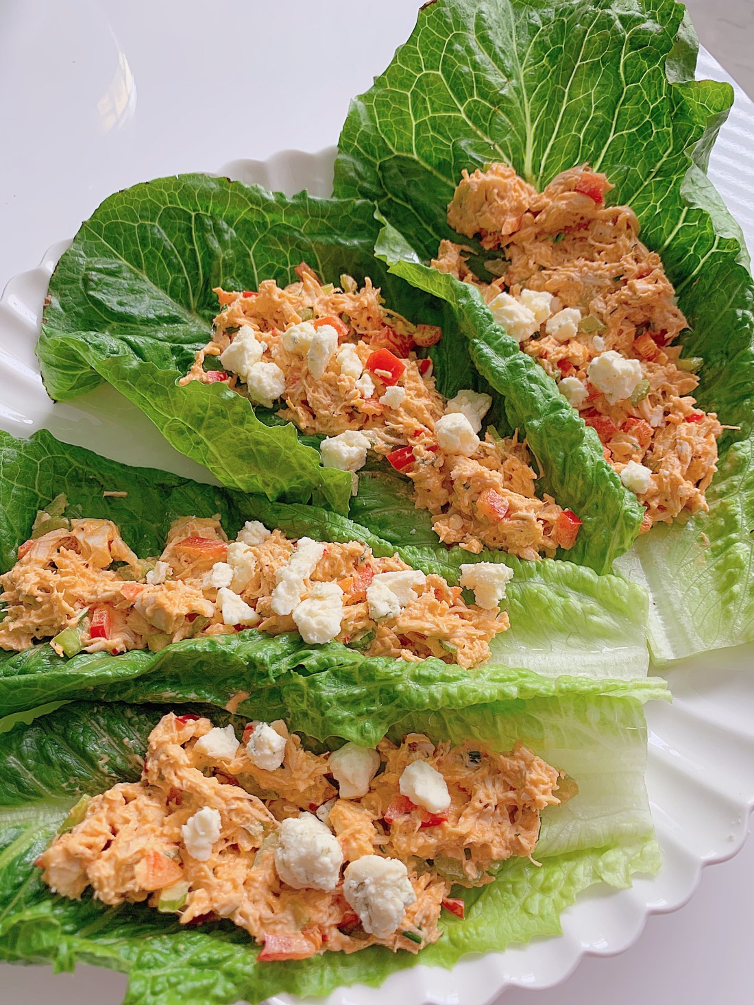 Bring a pot of water to a boil and add boneless, skinless chicken breasts/tenders. Boil for 25 minutes. When the chicken is done, chop it up and let it cool for a minute before mixing with finely chopped celery, minced bell pepper, herbs (I used fresh chives plus dried dill and dried parsley), salt and pepper, and equal parts plain Greek yogurt and mayo. Stir in buffalo sauce to taste. I piled the chicken salad inside romaine lettuce boats, topped with blue cheese. [See notes below for alternate serving method.]