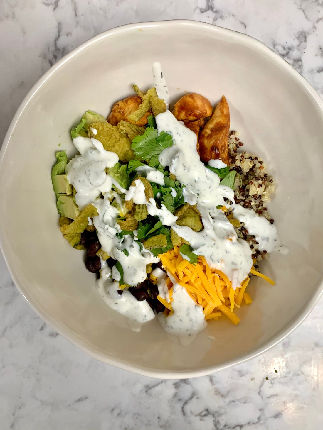 Start by cooking quinoa and getting your chicken cooked. I cut boneless skinless chicken breasts into small cubes, tossed with bbq sauce (no measurements) and cooked at 400 for 20 minutes. While those two ingredients cook, prepare your healthy pantry ranch dressing. Stir together plain Greek yogurt, the juice of half a lemon, garlic powder, onion powder, dried dill, dried parsley, and salt. Add water bit by bit until it reaches salad dressing consistency. You can add a pinch of mayo if you’d like, but it’s not really necessary. Finally, set up your other fixins. I used a mixture of black beans and corn (canned and frozen – you can use half the batch earlier in the week on Taco Tuesday), tomato, cilantro, avocado, shredded cheddar, and crispy fried jalapeno bits (from Trader Joes).