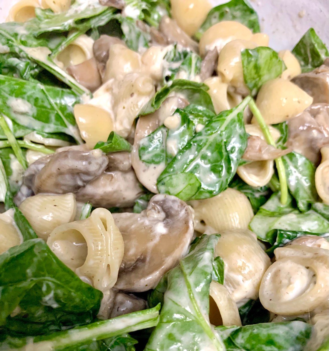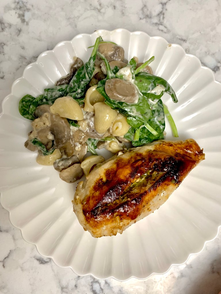 I adapted the recipe a bit because I wanted to cut some of the carbs and cream so I’d feel slightly less guilty about it. My adapted version still came out extra tasty (and reheated really well the next day). Start by cooking the pasta according to package directions. I probably used 1/3 of a box of my new fave shape, pipe rigate. Reserve 1/3 c. pasta water, drain, and set aside while you make the sauce. Heat some butter in a large skillet or pot over medium, add sliced button mushrooms (I used 2 boxes aka 16 oz), and sauté until they’re nice and soft (about 7 minutes). Add 1 sliced shallot and 1/3 c. white wine or chicken stock. Stir it up, add some half and half (maybe 1/3 of a cup), and stir some more. Let the mushroom sauce simmer until it reduces. Add the sauce to the pasta and toss with a bit of the pasta water. Toss several large handfuls of fresh spinach, 1/4 c. parmesan (eyeball it), more pasta water, more tossing. Crumble in some goat cheese (maybe 3 oz?) and toss again before serving. Note: if you prefer your spinach extra wilted down, I’d recommend adding it directly to the mushroom sauce.