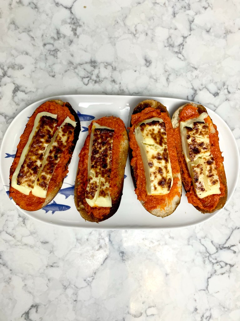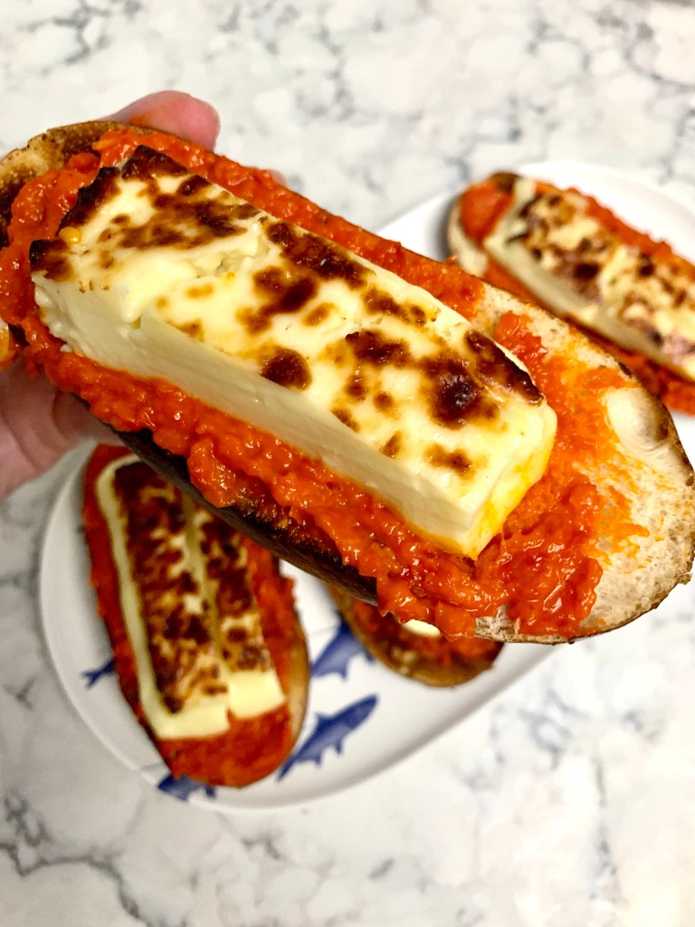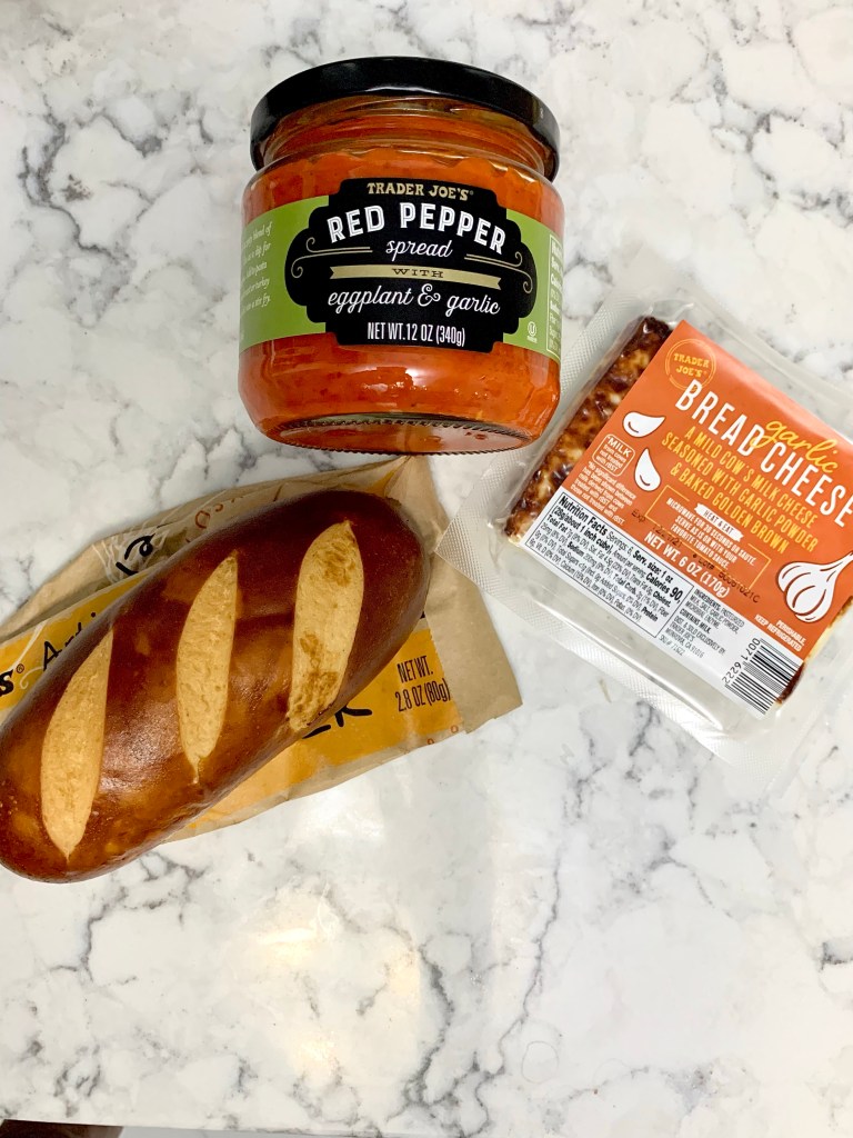 If you’re familiar with halloumi, this cheese is very similar, just pre-grilled and seasoned. It’s strongly recommended to warm it up and 30-45 seconds in the microwave should do ya. They recommend cutting it into strips or cubes and dunking it into marinara, which I agree would be quite tasty…but garlic bread and marinara felt a bit too on the nose for me so I made up something new. This appetizer uses 3 ingredients and takes 3 minutes to make. All ingredients are Trader Joe’s specific, but you could make some simple substitutions (like using halloumi for the cheese, red pepper spread or eggplant spread or even pesto for the sauce, and something crusty for the bread) and wind up with something delish.