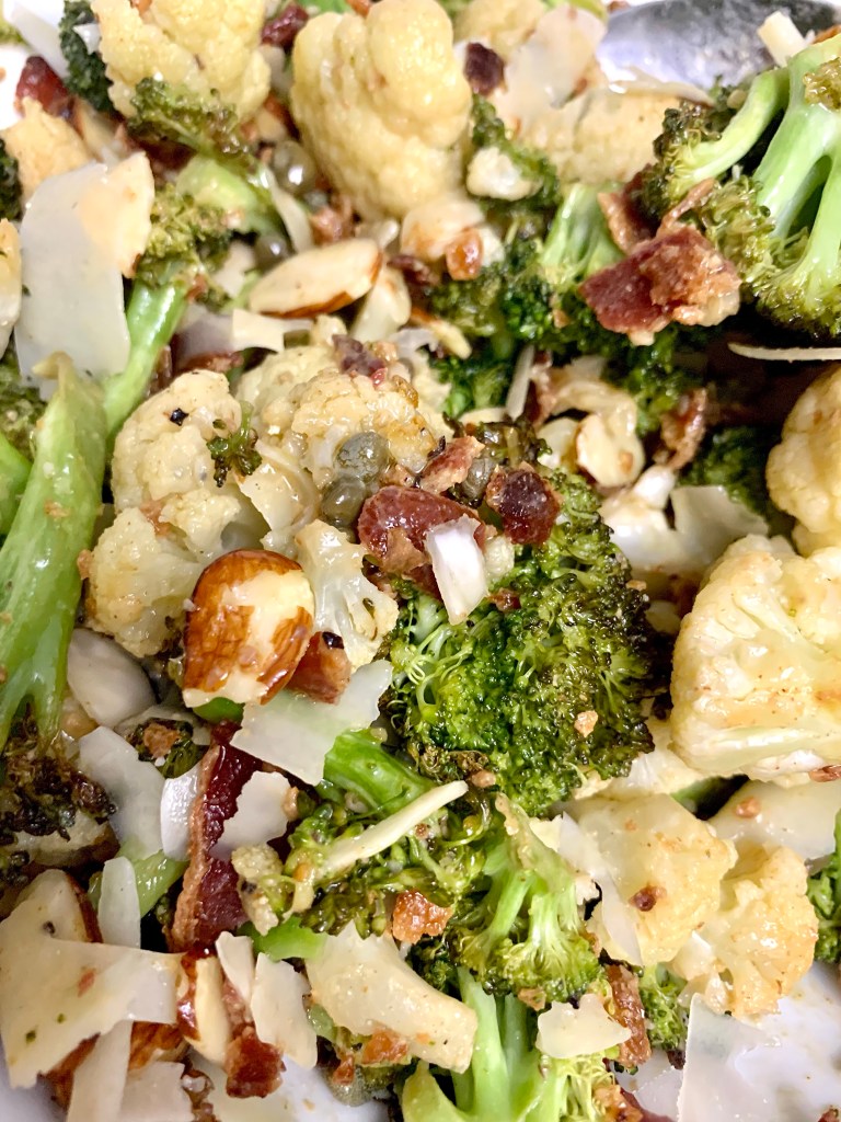 Get two baking sheets ready. On one, place 1 bag each of broccoli and cauliflower florets (or the equivalent to 2 small heads of broc and 1 head of cauli) and drizzle with olive oil, salt and pepper. On the other, place 6 strips of bacon. Get both baking sheets in the oven and roast at 350 for about 20 minutes. While that’s in the oven, prepare your dressing by whisking together 1/4 c. olive oil, 2 tbsp dijon mustard, 1 tbsp white wine vinegar (I used champagne vinegar), and salt and pepper. When everything comes out of the oven, crumble the bacon and toss it together with the broccoli/cauliflower and dressing. Add 1/2 c. sliced almonds, 3 tbsp of capers, however much shaved parmesan looks good, and toss again.