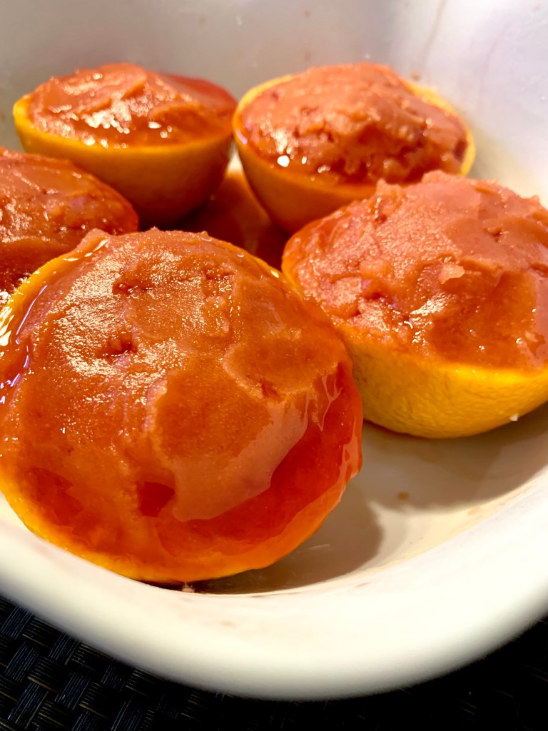 Luca was getting pretty good reviews as the latest Pixar film so I immediately made plans to have a family movie night with the boys. Of course, I had to theme the menu around the movie so we had a pasta meal that ended with a special Italian dessert. When I realized the movie took place in a seaside Italian town I immediately recalled the Positano specialty of lemon [or orange] sorbet served in a cup made from the lemon [or orange] peel.