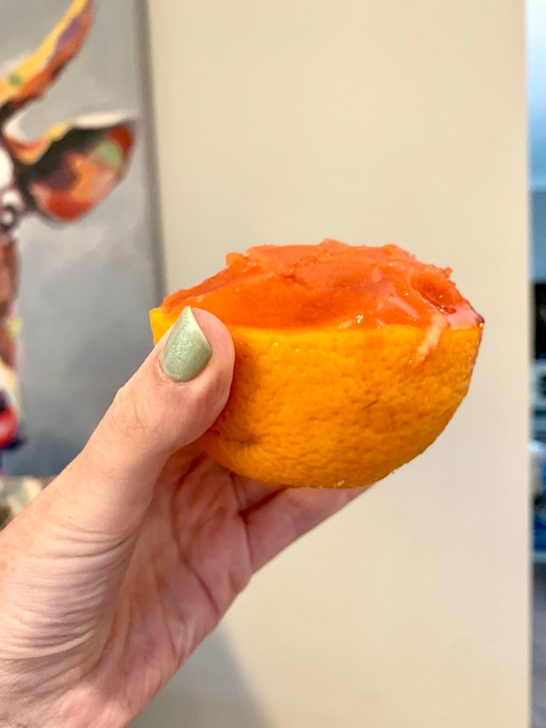 To recreate this dessert, simply halve the fruit, scoop out the flesh, and fill it with a mound of sorbet. For 8 servings (aka 4 oranges) we used about 2.5 pints of blood orange sorbet. It’s easy but just takes a bit of elbow grease, especially if the sorbet is very frozen. Once assembled, cover in plastic wrap and re-freeze til you’re ready to serve. If you’re feelin fancy, you can always top with a sprig of mint.