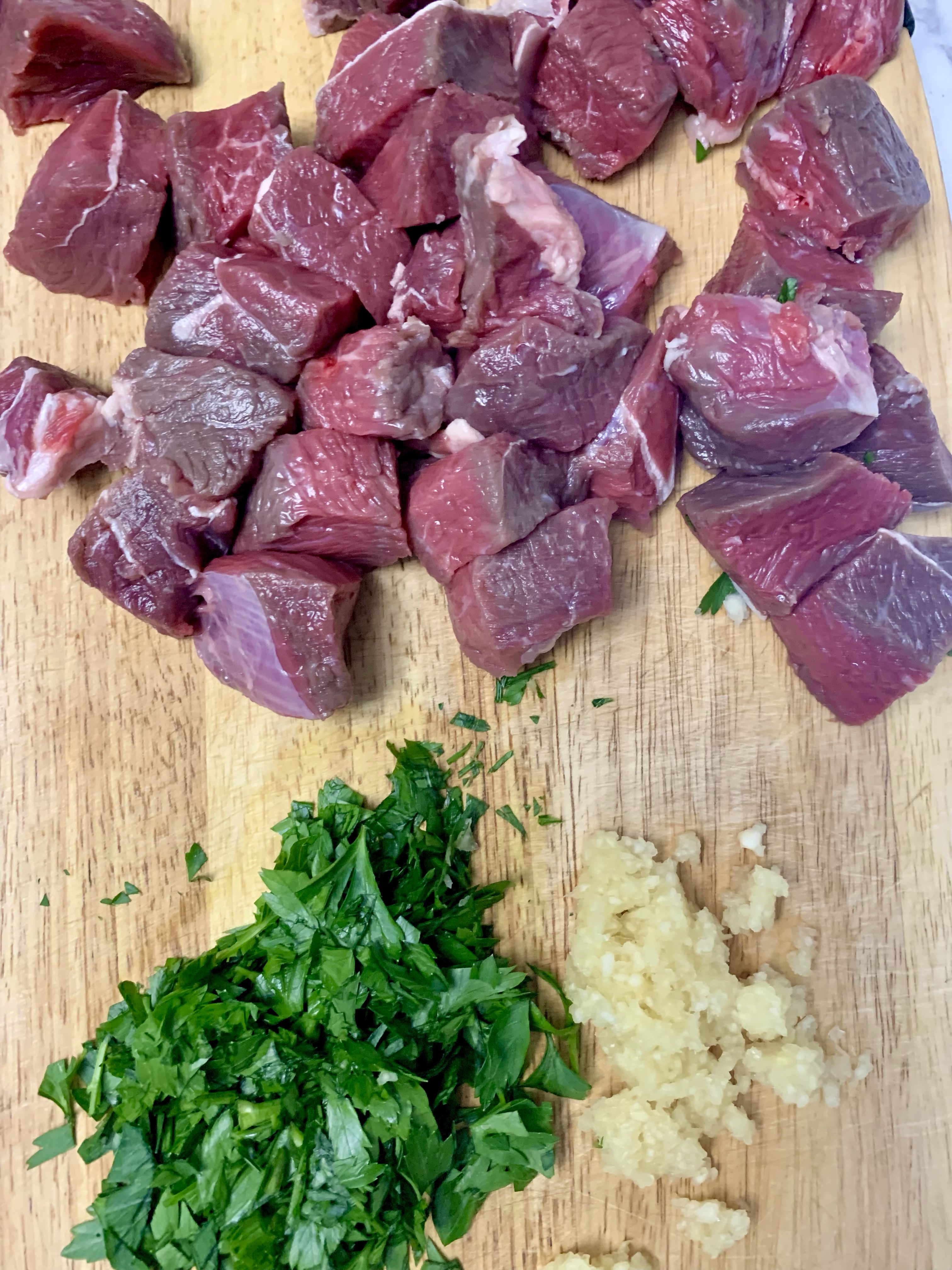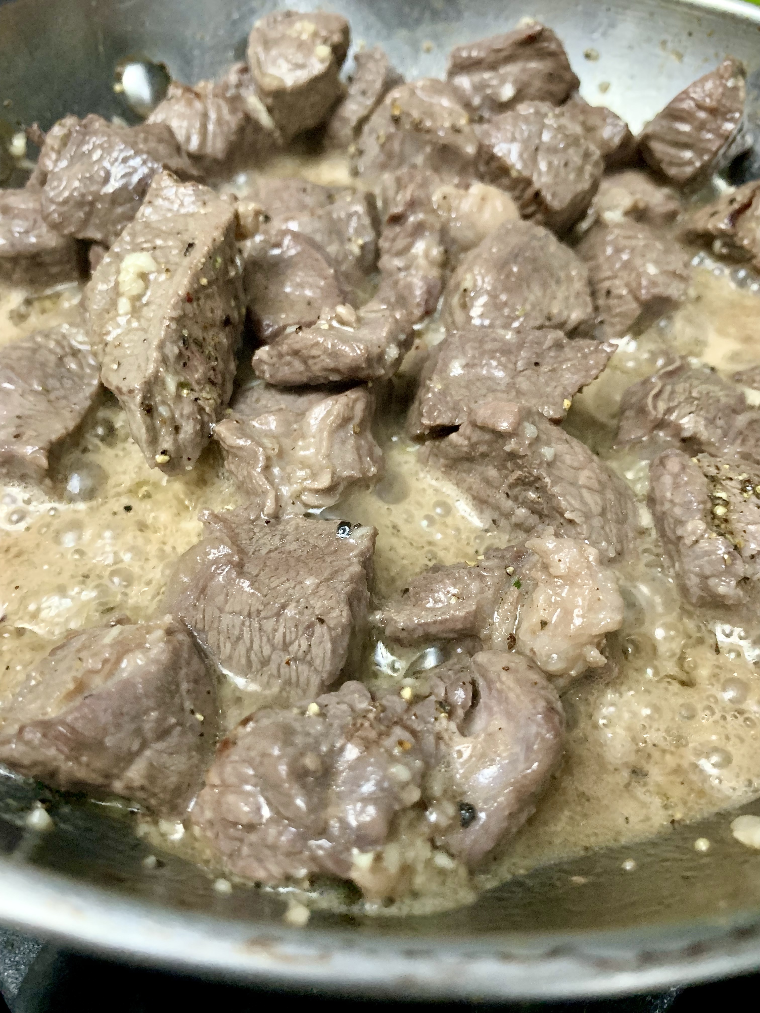 If you prep everything (ahem – everything…there are 5 very basic ingredients…and one of those is pepper, which requires no prep) this recipe will take mere minutes. First cut 2 lbs of NY strip steak (I used sirloin) into 1-in (or slightly smaller) cubes. Set aside while you mince 4 cloves of garlic and chop 1/4 c. of parsley (and set each of those aside). Now start cooking. Melt 8 tablespoons (1 stick) butter in a large skillet over medium high-heat. Add the steak cubes, season with salt, and sear until browned, flipping them halfway through, 6-8 min total. If your cubes are on the smaller side, you won’t want any more than 6 minutes. Add the garlic and a good dose of fresh cracked pepper and cook for 1 minute more. Remove from the heat, toss with the parsley. Done.