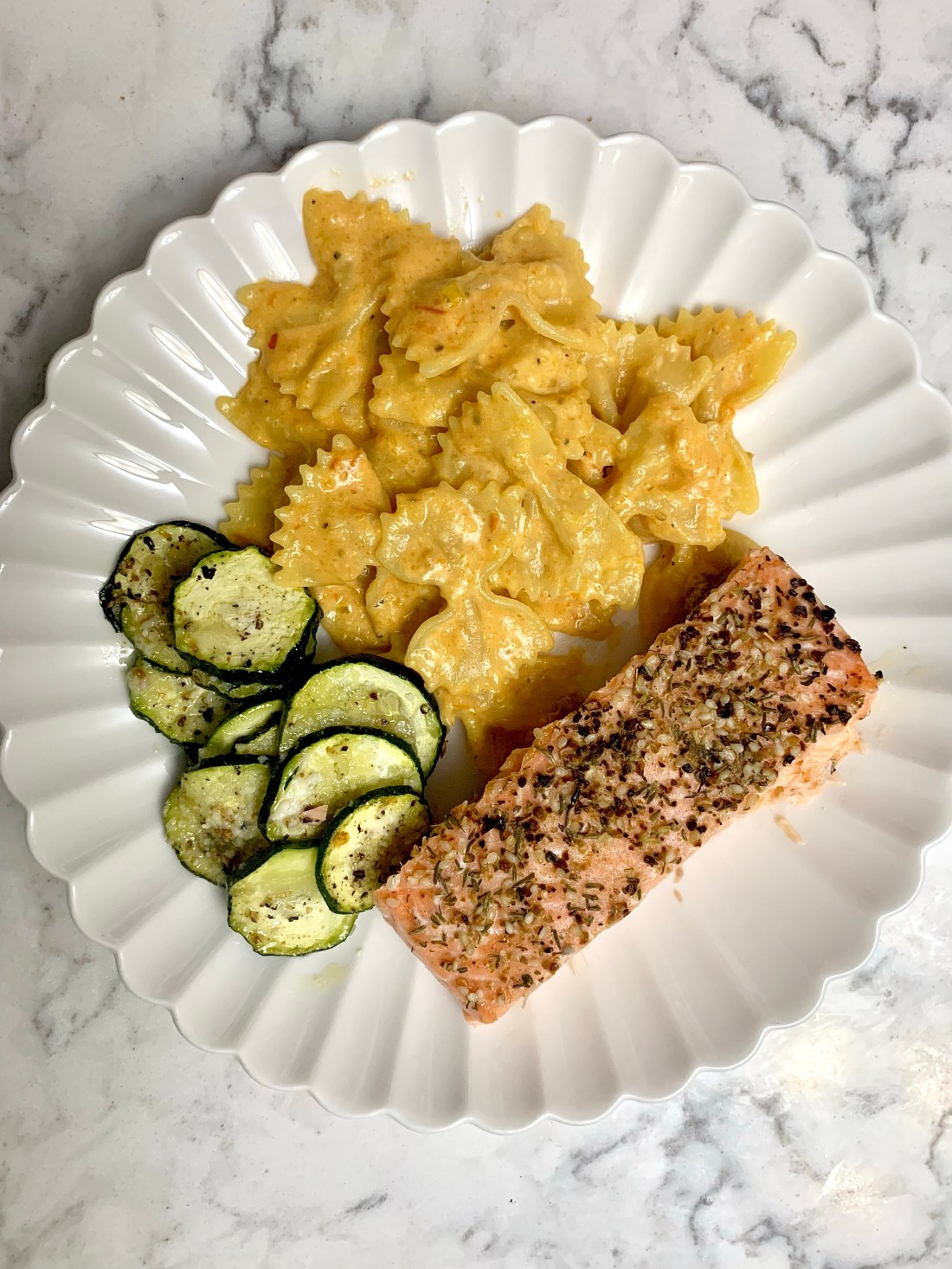 [I cut this recipe in half, but full recipe for a whole box of pasta is as follows.] Start by heating 3 tbsp olive oil in a pot over medium heat. Add 1 chopped onion, 6 cloves of minced garlic, and 1/4 tsp of crushed red pepper. Cook until the onions soften (4-5 minutes). Add 3 pints (2 lbs) of sun gold cherry tomatoes, along with some salt and pepper. Cook and stir stir stir for about 4 minutes until you see the tomato skins getting wrinkly and releasing their tomato juices. Separately, grind up some saffron threads (I used a mini mortar and pestle). In a heat-proof bowl, add 1/2 c. boiling water to the saffron to make some saffron water. Pour that saffron water over the tomatoes, reduce the heat so it’s at a constant simmer and let it cook for 10 more minutes so it thickens a bit. While the tomatoes simmer, cook 1 lb. of short pasta (I used bowties). Transfer the tomatoes to a blender and purée until smooth before pouring it back into the pot. Stir in 1/2 c. heavy cream and some salt and pepper. Drain the pasta, add to the sauce, and – as Jake advises – make it rain parm.