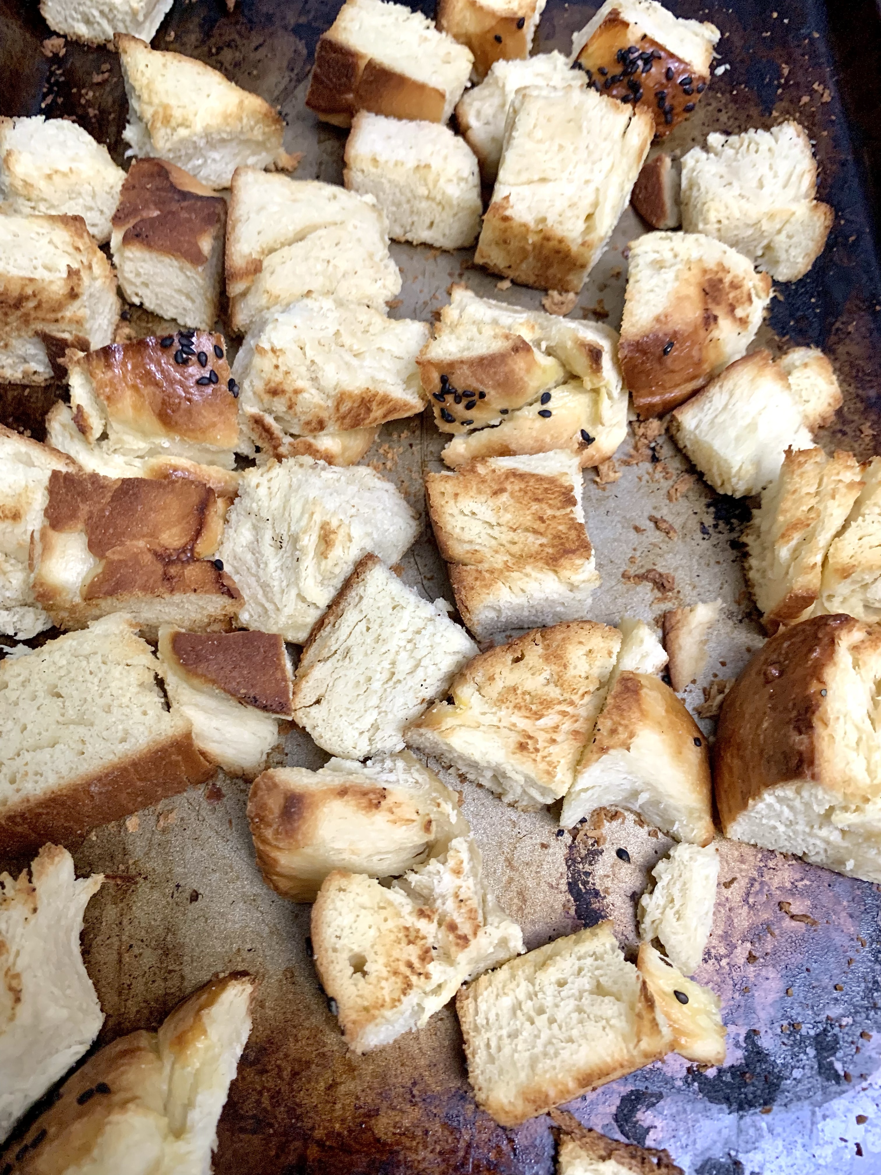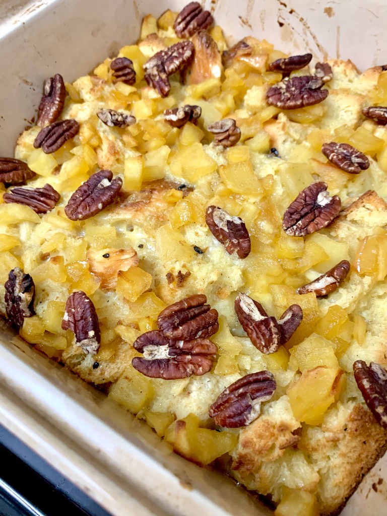 [I halved the recipe, but this is for a full one.] Heat oven to 375 degrees and grease a 9×13 baking dish. Cut a 1 lb challah into large cubes and toast, tossing twice, for about 12 minutes (it will have a light golden brown crust). While the bread toasts, heat 6 tbsp honey in a large nonstick skillet over medium-high and cook until it caramelizes, about 5 minutes — it’ll give off a lovely nutty aroma. Remove from heat and stir in 4 tbsp butter until it melts, then stir in 8 c. of peeled and diced apples (about 6 apples), vanilla seeds and pod (I just used some vanilla extract), and a pinch of salt. Return to medium-high heat, cover and cook, stirring frequently, until apples are soft and liquid has mostly evaporated, about 10 minutes. Transfer apples and any liquid to a large bowl. In a separate large bowl, whisk together 2 c. half-and-half or heavy cream, 1 1/2 c. milk, 5 eggs and 3 egg yolks, 1/2 c. sugar, 1/2 tsp. cinnamon, 1/2 tsp. nutmeg and 1/2 teaspoon salt. Gently toss in bread and half the cooked apples (save the other half for later). Pour into the baking dish, cover with tin foil, and bake for 25 minutes. Remove the foil and spoon the remaining apples on top. Top with pecans (recipe called for almonds but I went rogue) and return to the oven to bake, uncovered, for another 20-25 minutes. Cool for at least 15 minutes before serving warm.