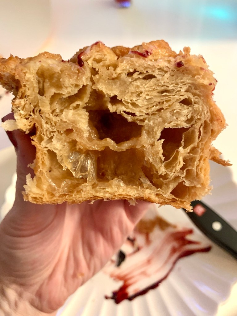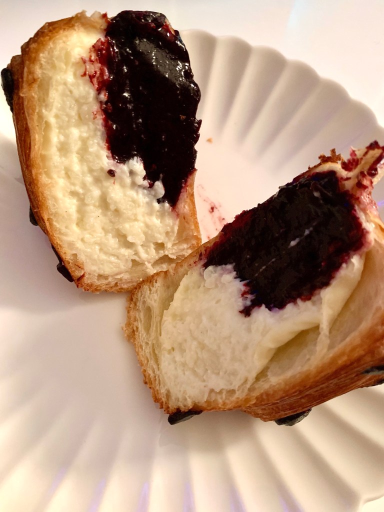 Next I tried one of the more innovative croissants, the huckleberry vanilla riz au lait cube. It’s a brioche on the outside and a vanilla Arborio rice pudding with huckleberry jam on the inside. While I’m not someone who sits around eating rice pudding (or any pudding-y thing) on it’s own, I liked when it was inside a pastry, giving it some additional texture. And, since rice pudding is naturally more toothsome than cream, I much preferred this as a filling.
