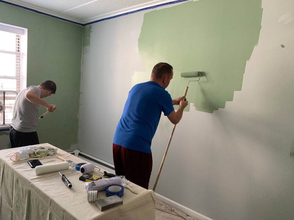 On Saturday, Smerg came over and he and Albie spent allll day painting the guest room (soon to be the bambino’s room). I absolutely LOVE the color. Truth be told, this is how I wanted to paint this room when we moved in, but I had been too overwhelmed by other renovations that I decided to paint the entire apartment one color to keep things simple. Having a new tenant was the kick in the pants we needed to do what I always wanted to do in this room. As the room comes together, it definitely looks more like a grown up room than a nursery…but ya know what? I love that. (And don’t worry, I’ll add a few elements, like decals, to kid-ify things a bit.
