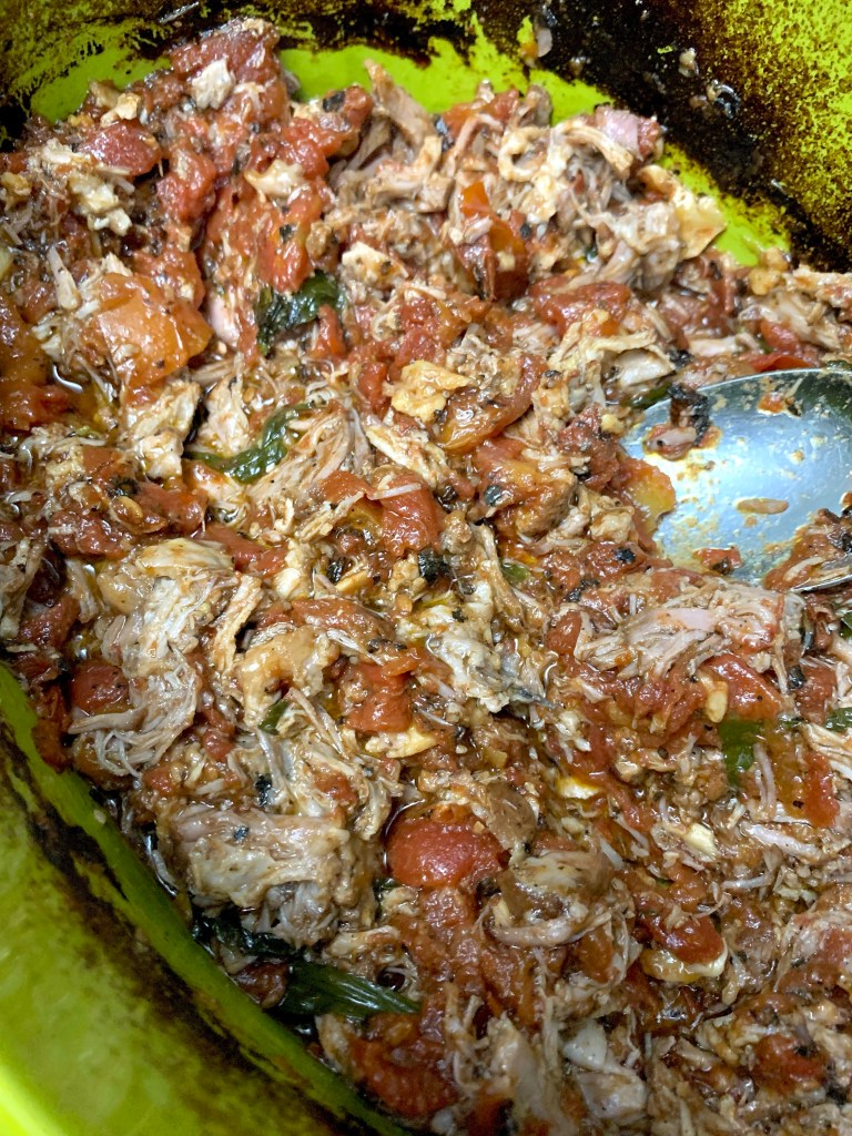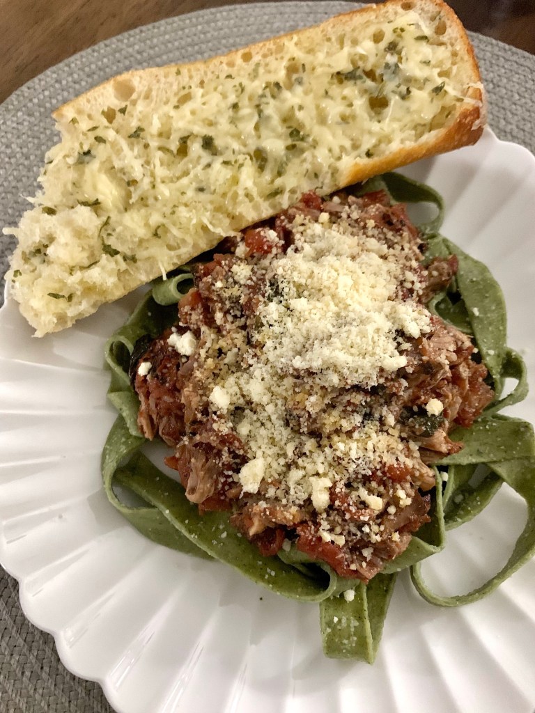 Heat the oven to 350 and season 2 – 2.5 lbs boneless pork shoulder (trimmed of fat) simply with salt and pepper before searing it (in oil) on all sides in a Dutch oven (8-10 min). Reduce the heat to medium-low, add 10 smashed garlic cloves and 1 1/2 tsp red-pepper flakes, and stir to combine. Add 3 (14-ounce) cans fire-roasted tomatoes, 1 c. red wine, and 5 sprigs of fresh basil (sprigs, not leaves). Stir it up, add salt and pepper, and bring to a boil over medium-high heat. Cover, transfer to the oven, and cook 2 1/2 to 3 hours. When it comes out of the oven, you should be able to shred it up easily with two forks (mix with tomato sauce as you go) directly in that Dutch oven, which you’ll bring right to the table as your serving dish because this is a rustic meal.