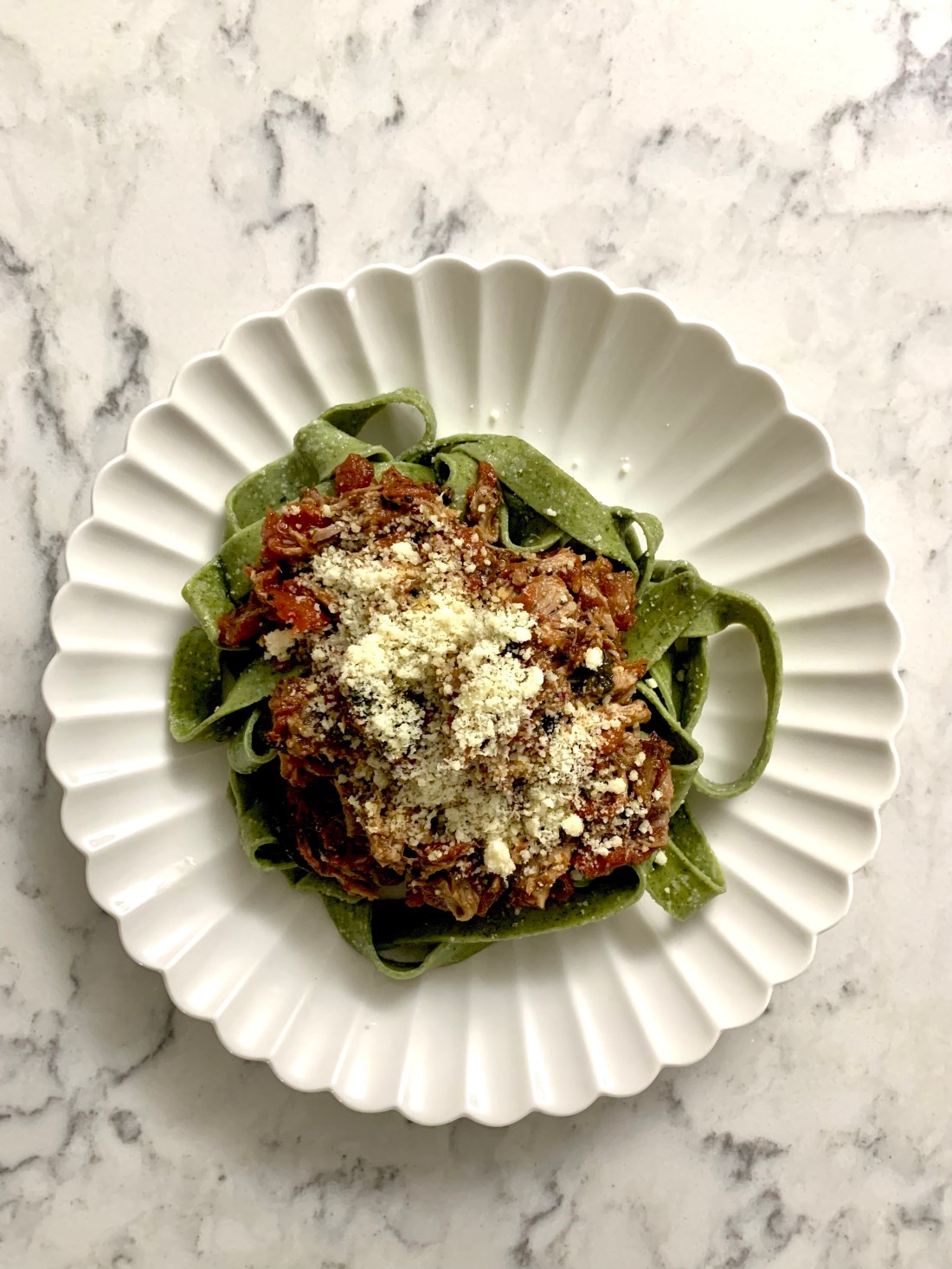 There’s something special about a ragù. Like a bolognese, it’s something that just simmers along for hours until it turns into the homiest sauce. The difference is that a ragù (at least one like this) results in meat whose tenderness is the marker of success. You’re not just simmering, you’re braising. That means fall-off-the-bone, melt in your mouth meat. For this particular sauce, I followed this recipe from NYT for braised pork all’arrabbiata and simply cut it in half. [Following recipe is for the full portion, which feeds 6-8]