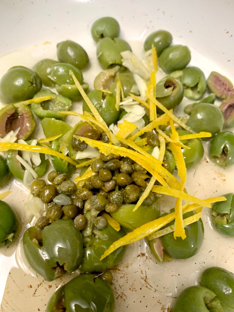 Preheat the oven to 275. Season a 1.5 lb piece of salmon with salt and rub a bit of olive oil onto it. Roast it in a cast iron pan for 20-30 min – you’ll know it’s done when it’s flaky. While it’s in the oven, smash 1 c. castelvetrano olives to remove the pits (or buy them pitted if you can find them that way at an olive bar) and add them to a pan. Thinly slice 2 garlic cloves and peel strips of zest from a lemon, then slice those strips into thin slices lengthwise. Add the garlic, lemon zest, 2 tblsp capers, and 1/3 c. olive oil to the pan and cook over medium heat for 5-6 minutes. You want to cook it until the garlic softens but make sure not to let it burn. Slice half the zested lemon into rounds, cut into half moons, remove the seeds, and add to the olive mixture along with the juice from the non-cut half of lemon. Crack in a bunch of black pepper. When the fish is done, spoon the olive/lemon mixture on top. Finally crush some kettle chips with your hands and sprinkle over the whole dish. Serve directly in the cast iron skillet.