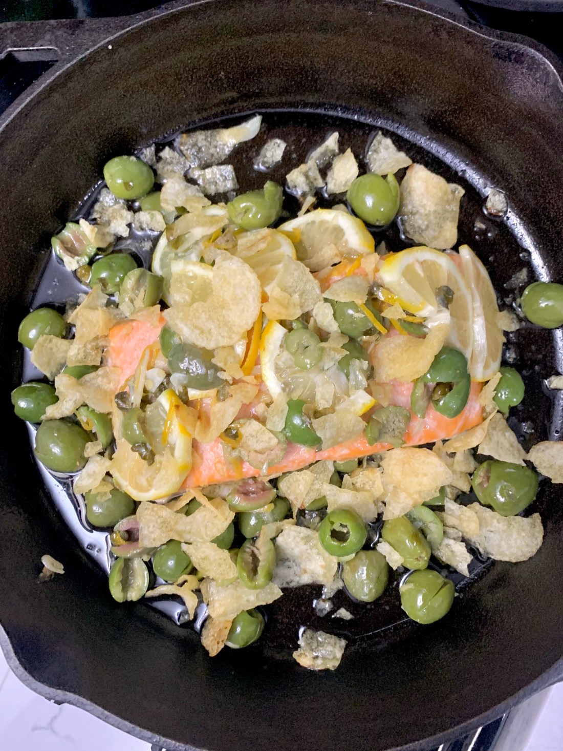 This recipe was so simple and resulted in no leftovers. I poured the full contents of the olive/lemon pan directly into the cast iron skillet (vs. spooning) and I would go with spooning next time as my dish came out a bit oily. In fact, I would just use a bit less oil overall. Salmon and olives are naturally oily so this dish doesn’t need a ton of extra fat. Excess oil aside, it was such a great meal. And how can you not feel fun when there are potato chips in your grown up meal?