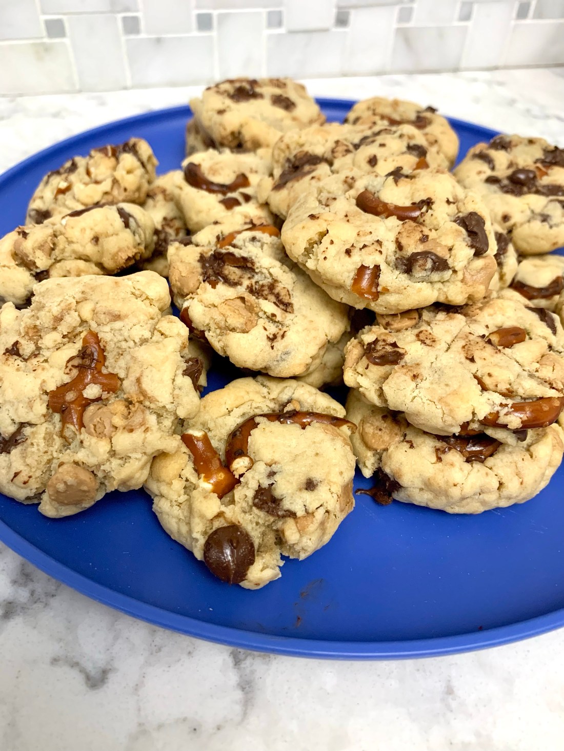 Due to COVID protocol, our building decided to shift our annual holiday party (typically held in the lobby in December) to a November shindig in the courtyard. I signed up to bring chili for the cookoff and some cookies. When I found a recipe that claimed to be the “easiest,” I decided to see if it was true. When it comes to baking, easiest is pretty much the most complicated I can handle. While the recipe was for chocolate chip cookies, I decided to add some extra mix-ins. I had some salted caramel chips in the pantry (from Trader Joe’s) and also thought crushed pretzels would be perfect. I had cookies with potato chips once and loved so I knew pretzels would work with the chocolate and caramel flavors.