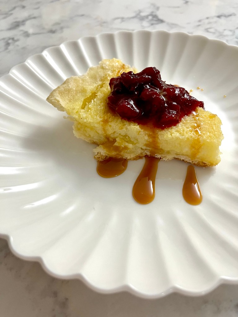 I recommend using a deep dish pie crust because we definitely had spillover. Otherwise, this was a very simple pie to pull together that uses few ingredients, most of which you’ll already have in the house. When it comes to toppings, I got some salted caramel sauce, but honestly that was too much sweet-on-sweet. Instead, the cranberry sauce we had on the table, which is a bit tart, was a better complement to the already sweet pie. Fresh berries would also be great, especially in the summer. Also, this recipe was so easy to double and pie crusts come in packs of two anyway so we went right ahead and made two of these, sticking one in the freezer to bring to our second Thanksgiving dinner the following week.