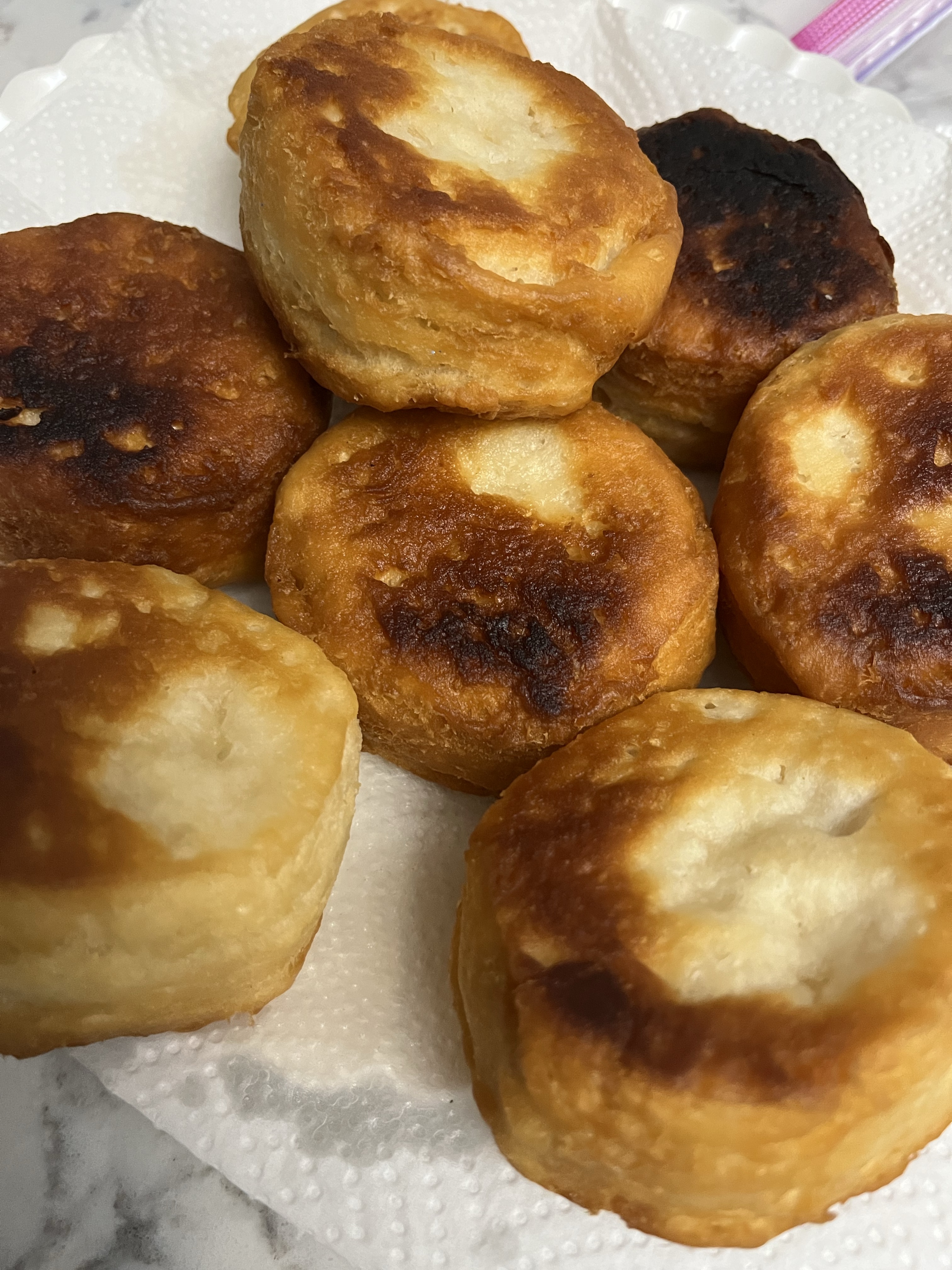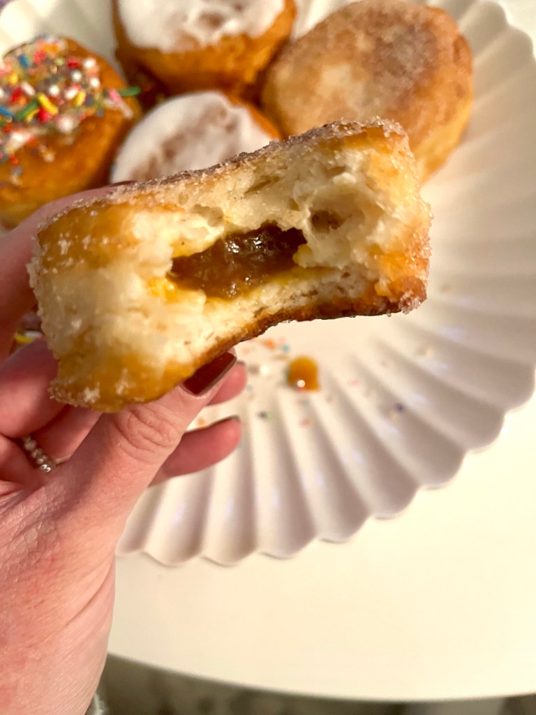Happy Chanukah! After learning you can easily make doughnuts at home by frying up some canned biscuits, I decided to try my hand at sufganiyot (aka jelly doughnuts) to celebrate the first night of Chanukah last night. Truthfully, this holiday snuck up on me. It’s the earliest it’s been in years and I just wasn’t prepared. Since the gifts didn’t arrive in time, I wanted to do something special to commemorate the holiday and this was the perfect activity.