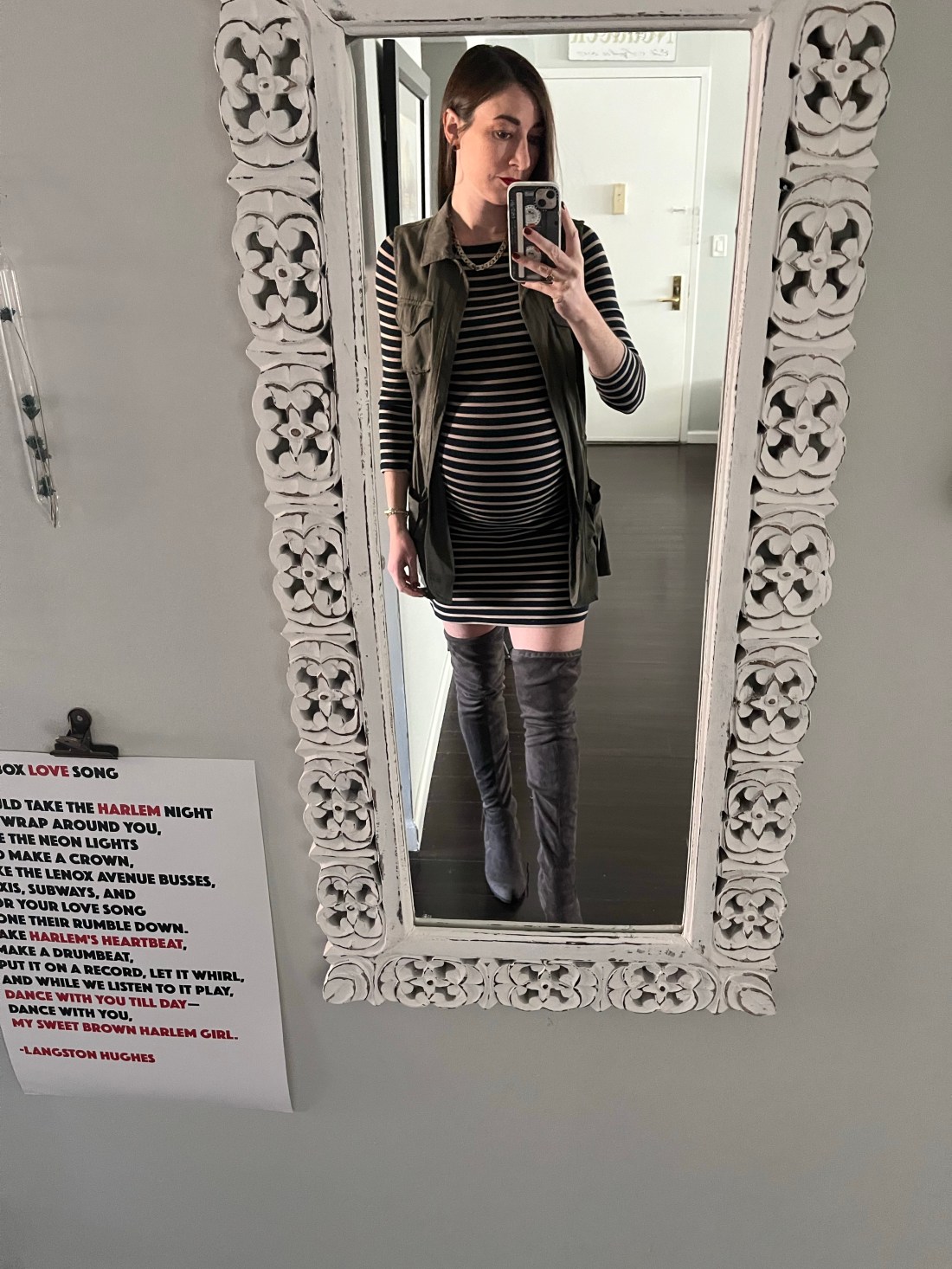 Overall, I haven’t really had many symptoms. No morning sickness or real pain…it’s been super easy. And people are so nice to pregnant women! Now that I’m very clearly pregnant, people offer me their seat on the subway and strangers I pass outside congratulate me or tell me I look beautiful. Life is pretty much the same as before I was pregnant except I’m not wearing crop tops, my Peloton metrics are down, and I can’t have booze. It’s a very easy pregnancy (I’m lucky!) but if given the choice I’d want the crop tops, a PR, and wine. Just being honest.
