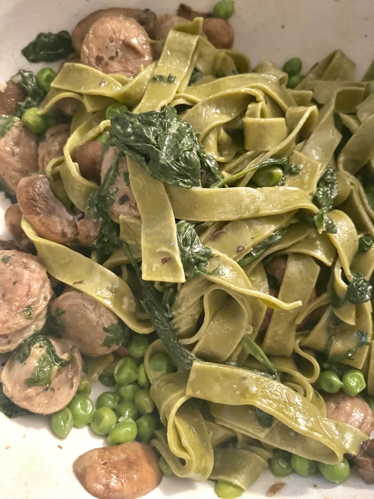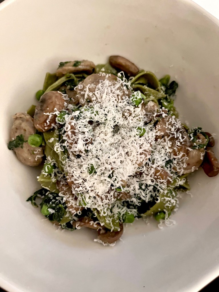 Start by sautéing a package of mushrooms in oil or butter until they’re nice and soft. After about 5 minutes, start boiling your pasta water. If you’re using fresh pasta (I had 1/2 lb), it’ll only take 2-3 minutes to cook. If you’ve timed it right, it should all finish at around the same time. Now, back to those mushrooms. When they look about done, add sliced truffle brats and start browning. At this point, the mushrooms will have started releasing a lot of moisture. This is good; it’s how you get a sauce. Add a bag of fresh spinach and some frozen peas. Now, add a touch of half and half and a bit of grated parm. That half and half and parmesan will latch onto the mushroom juices and, if you let it reduce for a few minutes, will create a lovely and very light sauce. Toss the pasta with the mushroom sausage sauce, add a bit more parmesan, and finish with maldon salt and pepper.