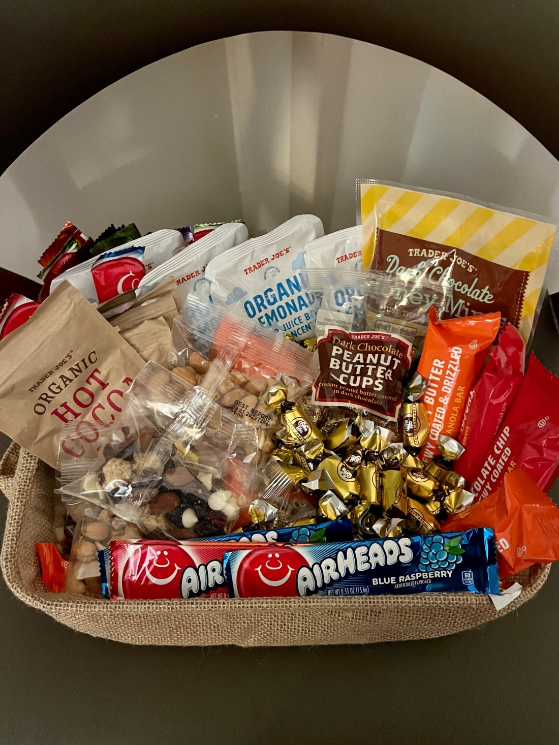 - Gift Baskets: I brought two gift baskets for the nursing staff (one for labor & delivery; one for postpartum team) to thank them for all their hard work. I got a 2-pack of baskets on Amazon for about $12 total and filled with a ton of stuff to make them feel energized and loved. I got some candy in bulk from Amazon (60 Airheads for $8) and the rest from Trader Joe’s (lemonade pouches, hot chocolate mix, various chocolates/candies, individually wrapped trail mix and nuts, and granola bars). In total, I spent under $75, but they were plentiful and I think they were appreciated. Before bringing them to the nurses’ station, I included a personal thank you note in each. The baskets themselves arrived folded so we stuck them and all the fillings in shopping bags to carry into the hospital and just assembled them there.