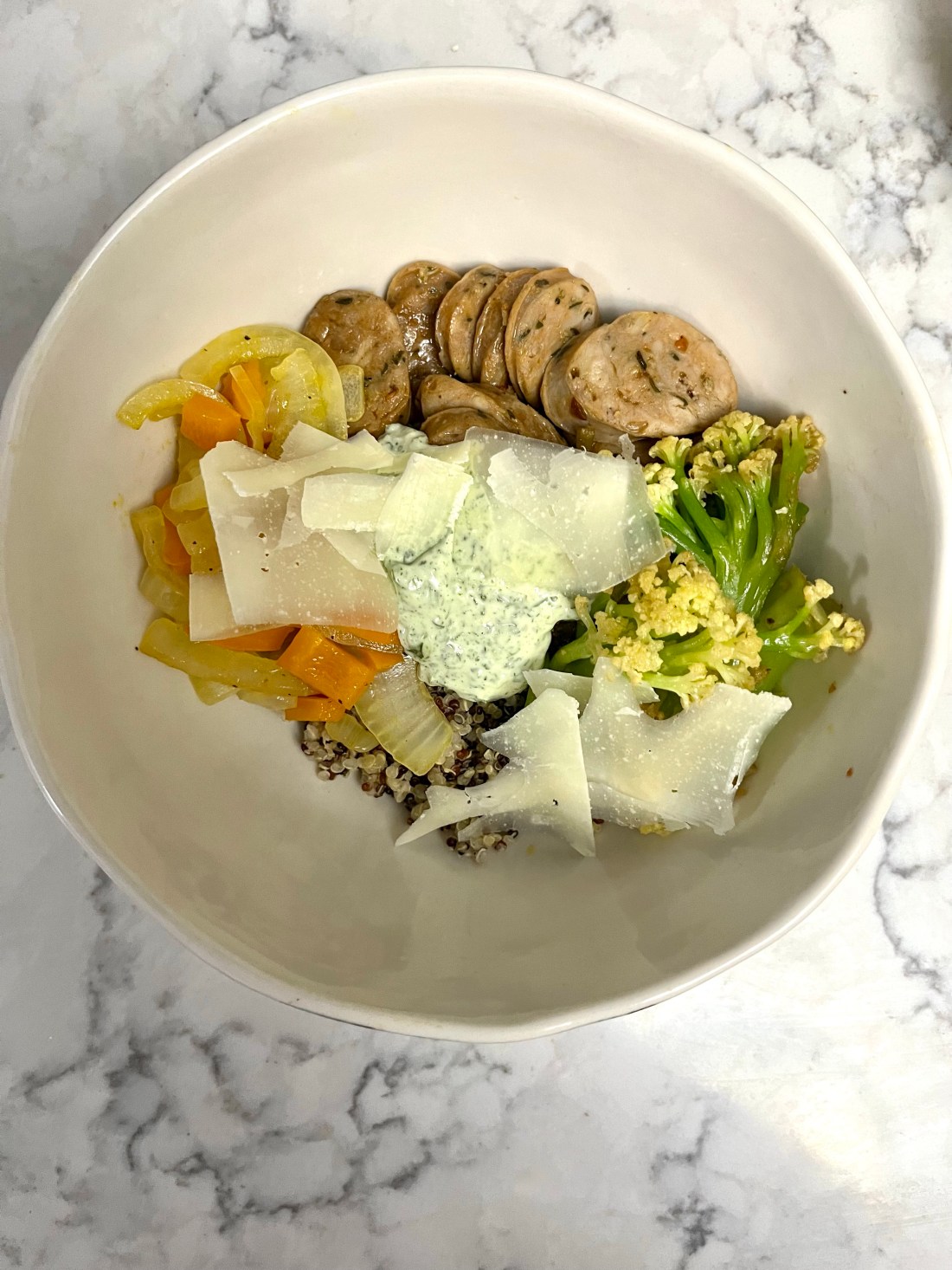 Start by sautéing sliced bell pepper and onion in some olive oil while get some quinoa going in the rice cooker. Season with some salt, pepper, and garlic if you’re feelin it. When those veggies have softened, remove them and prep your next veggie. I originally wanted to do broccoli rabe but it was sold out and instead got baby cauliflower, something I didn’t even know existed. Either works, but I was pleasantly surprised by the baby cauliflower since it wasn’t quite as tough/bitter as broccoli rabe. Another happy accident! Remove your baby cauliflower or broccoli rabe from the pan and sauté sliced chicken sausage until it’s nicely browned (use a flavor like Italian sausage or garlic and parsley). Finally, prepare your toppings: shaved parmesan and a basil mayo (mayonnaise, handful of torn fresh basil, one clove grated garlic, and salt in a food processor or immersion blender).