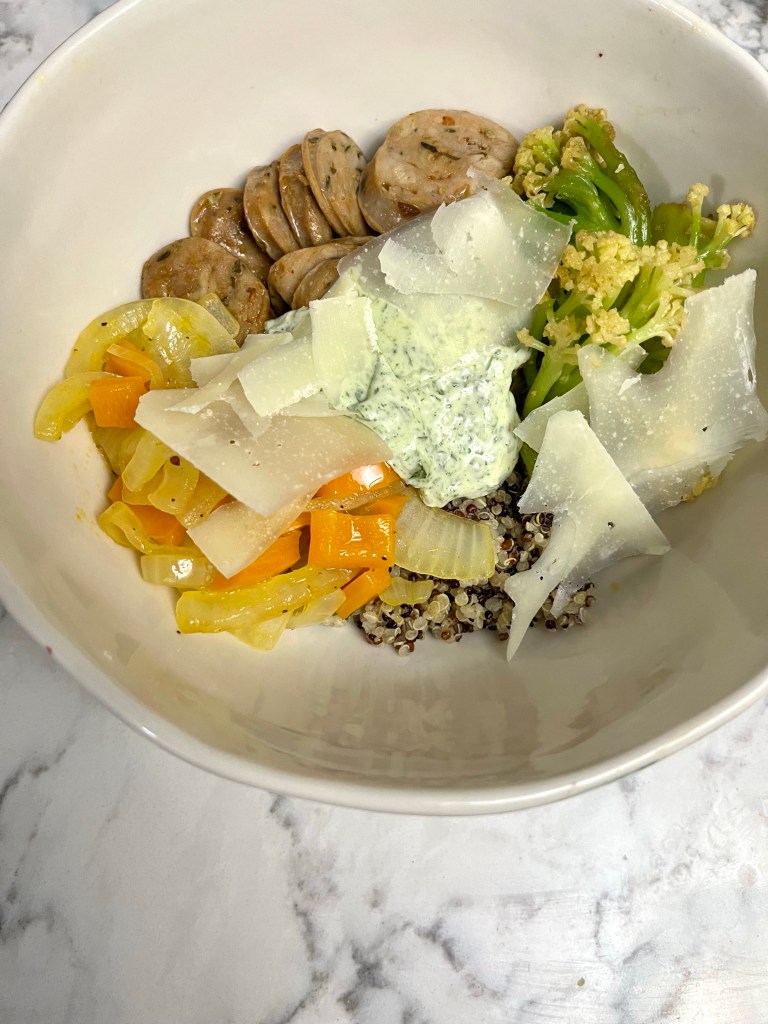 Sausage and peppers is a classic Italian family style meal. I like it fine enough, but it usually leaves me wanting more. I think part of it is that I need a carb and/or real vegetable to round it out and also that I want something a bit less greasy. Turning it into a quinoa bowl gives you all the right flavors but feels more like a full, satisfying meal. My original intention was to serve this with a roasted red pepper aioli, but I realized my roasted peppers had expired when I took them out of the fridge. Luckily, I had a ton of basil so I made a basil mayo that may have worked even better than my original sauce. I love a happy accident.