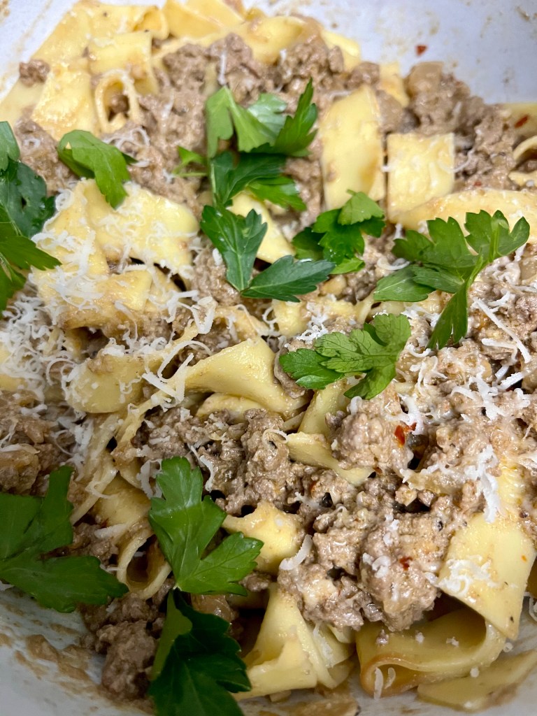 Cook down 1 chopped onion and 2 minced garlic cloves in olive oil for about 20 minutes until they’re golden (be careful not to let the garlic burn). Meanwhile, in a separate saucepan, combine 2 c. chicken broth, 2 sprigs rosemary (keep on stalk), 2 sprigs thyme (or some shakes of the dried stuff), and 3 bay leaves. Bring the broth to a boil and then reduce to a simmer. Refocusing attention to the onion mixture, add 2 tsp cumin, 1 tsp crushed red pepper flakes (there will be some nice heat here), 1 tsp fennel seeds (if you have em), 1 tsp smoked paprika, and some hefty grinds of cracked black pepper. Stir it all up, increase the heat to medium-high, add 1 lb ground beef, and brown it all up while breaking the meat apart. Once the meat has browned, pull the herbs out of the broth and add about half of it to the meat mixture. Don’t get rid of the rest of the broth – you’ll probably need to thin the sauce out a bit later. Simmer the meat sauce for 20 minutes and then add 1 c. of heavy cream or half and half and simmer for another 15 minutes until the sauce thickens up. While the sauce turns into a sauce, cook up a pound of pasta (pappardelle is perfect here). Once the sauce looks ready, add a half c. grated parm and stir to combine. Now it’s ready. You may need to play around with it a bit – add a little more broth…a little more heat…whatever you need to do to get the sauce to the right consistency. Toss it together with the pasta, garnish with fresh parsley and extra parm and you’re good to go.