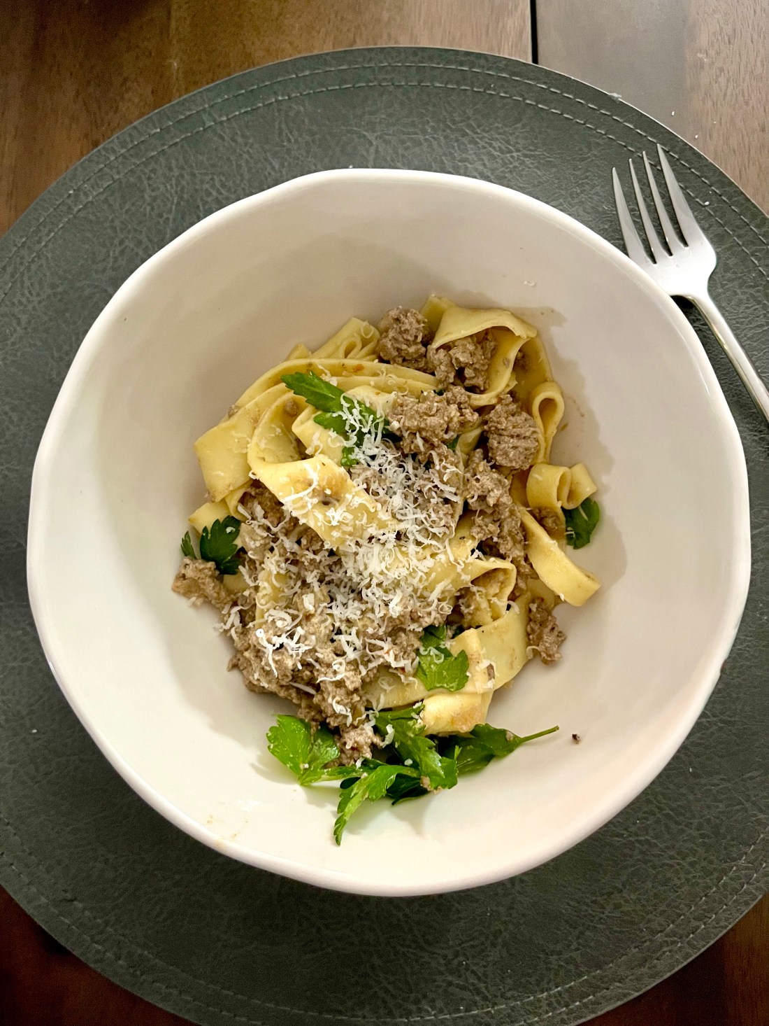 We all know (and love) the red when it comes to ragu, aka meat sauce, but I’m here to tell you that a white ragu is where it’s at. I stumbled across this recipe on my Google homepage and upon realizing it was a Raffetto’s recipe I knew it would be good. You may recall how much I love Raffetto’s from this post. I followed the recipe with a few small tweaks: used dried thyme instead of fresh, omitted fennel seeds (because I didn’t have any), and used half and half instead of heavy cream. The changes were minimal so the essence of the dish was still strong. It was also easy to make, it just takes a bit of time for the flavors to simmer together, as is typically the case with a good meat sauce.