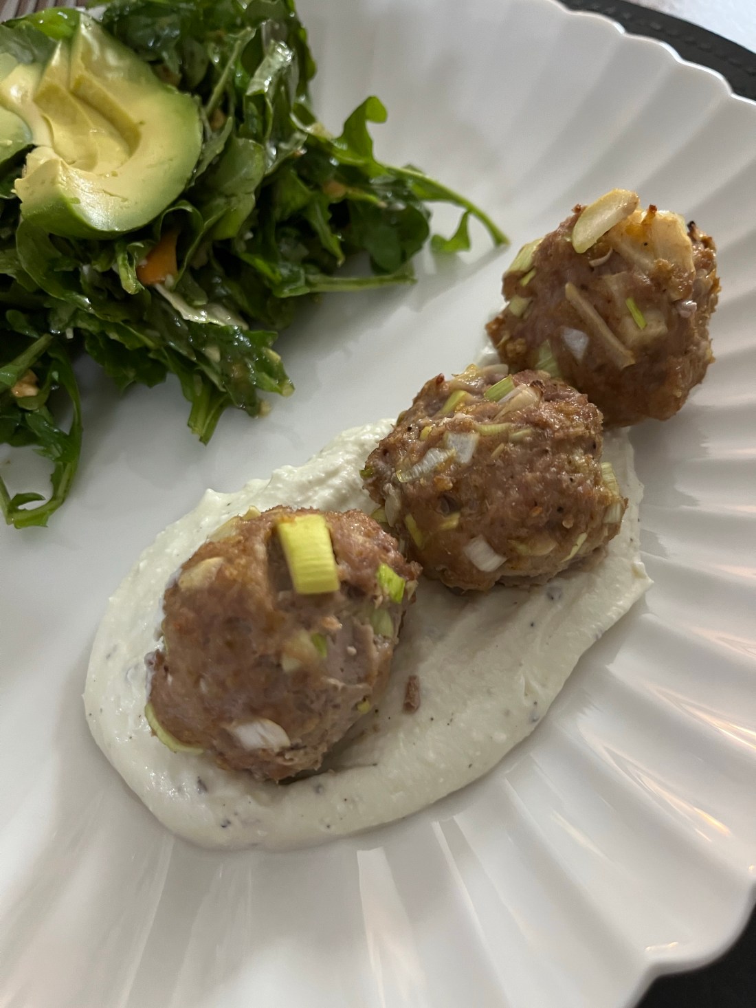 Start by combining 1 lb ground turkey with 1 large chopped leek, 1 egg, breadcrumbs (eyeballed), and spices to taste (paprika, garlic powder, turmeric, and salt). Parsley would be great if you’ve got it. Place on a silpat and bake at 425 for 10-12 minutes. HOT TIP: I was in a rush so I just tried to finely chop the leeks and added them in raw. The real move would be to sauté them for a bit so they soften. As far as the onion family goes, leeks are pretty mild, but sautéing them for as little as two minutes would really remove all bitterness. Downside: you’ll have a pan to wash. Upside: You don’t have to worry about chopping them so finely if you do that. Do not be lazy like me. While the meatballs cook, prep some whipped feta by mixing feta with Greek yogurt and some pepper, adding olive oil as you go to get it to the right consistency. (I used about a 1:2 feta/yogurt ratio.)