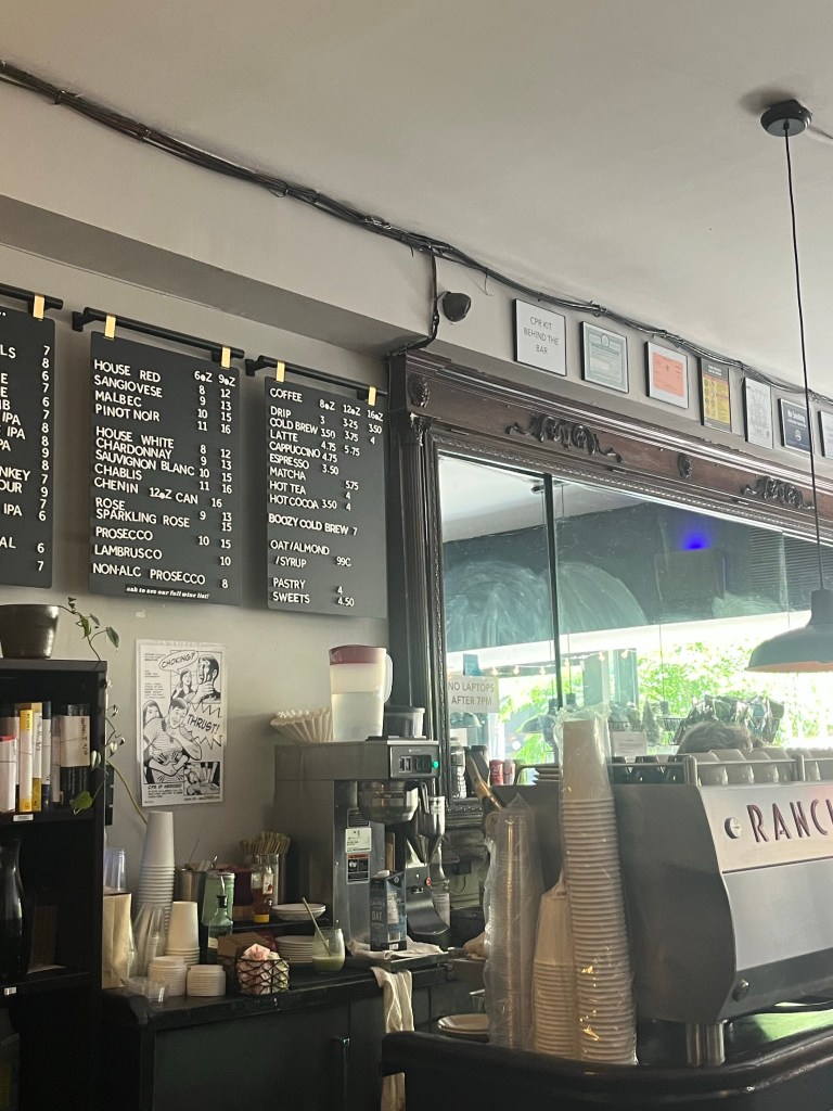 I started by browsing the shelves and immediately noticed they have a great selection. There weren’t a million books, yet somehow I saw sooo many from my TBR list. After choosing somthing fun (it was a Summer Friday, after all) I went back to the bar to sit with my book and an iced latte. I also have to say it was great perusing bookshelves with coffee in hand. It was a real main character moment. After my latte, I couldn’t decide if I wanted more caffeine or if it was time to switch to something harder (like I said, Summer Friday). Why choose? I got a boozy iced coffee and it was wonderful.