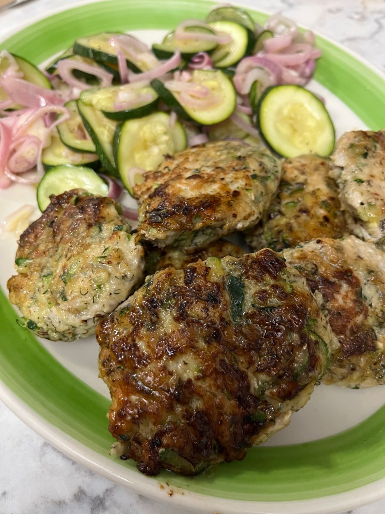 Slice 1.5 large zucchini diagonally then spread them out and sprinkle with salt to draw out the moisture. While all that water is getting pulled out, thinly slice a shallot into rings and stir with salt, pepper, 2 tbsp red wine vinegar, and 2 tbsp olive oil. Set aside. Over a large bowl, grate the remaining half zucchini with a box grater, add 1/3 c. bread crumbs, 1.5 tsp fennel seeds (I used caraway seeds), 1 tsp red pepper flakes, 1/3 c. dill (or some good shakes of the dried stuff), salt & pepper and 1 lb. ground chicken. Mix it all together and form 8 patties. Heat some oil in a cast iron skillet and cook the zucchini until it’s tender to the touch. You may need to work in batches. When the zucchini is cooked, add it to the bowl with the shallots. Now use the same pan to cook the chicken patties until they’re nice and browned on the outside (about 3-5 min/side). It may splatter, so feel free to cover with a lid or baking sheet. Serve the patties with the zucchini shallot mixture and a gorgeous dollop of thick Greek yogurt.