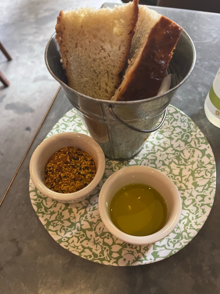 Anytime a place is called a wine bar, I imagine the food is snack-y and tasty but also standard. You’re thinking meats and cheeses, right? Maybe a cute meatball? Well here the menu is far more substantial and far more unique. Many people hold off on the bread so they don’t spoil their meal, but that’s not something you should do here. It’s soft, dense, and sweet and comes with oil and dukkah that’s just perfect.