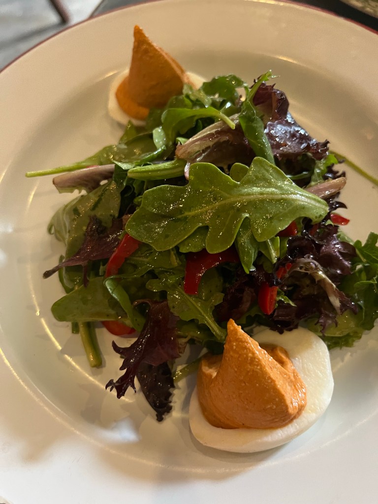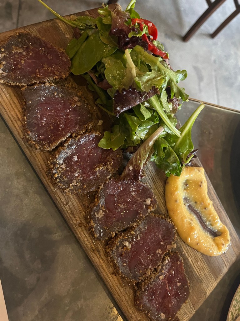 I got two smaller items for my main because I wanted to try more than one thing. First up were the deviled eggs, which were piled high with filling and came with an arugula and peppadew salad that was perfectly dressed. I also got the elk carpacio because I know that South African cuisine is big on sausage and game so I needed to get something in that direction. The homemade mustard accompaniment was perfect and it came with more of that arugla peppadew salad that I enjoyed. Don’t be scared off by the fact that this is elk. It’s not overly gamey and ideal for someone who gets down with a charcuterie platter.