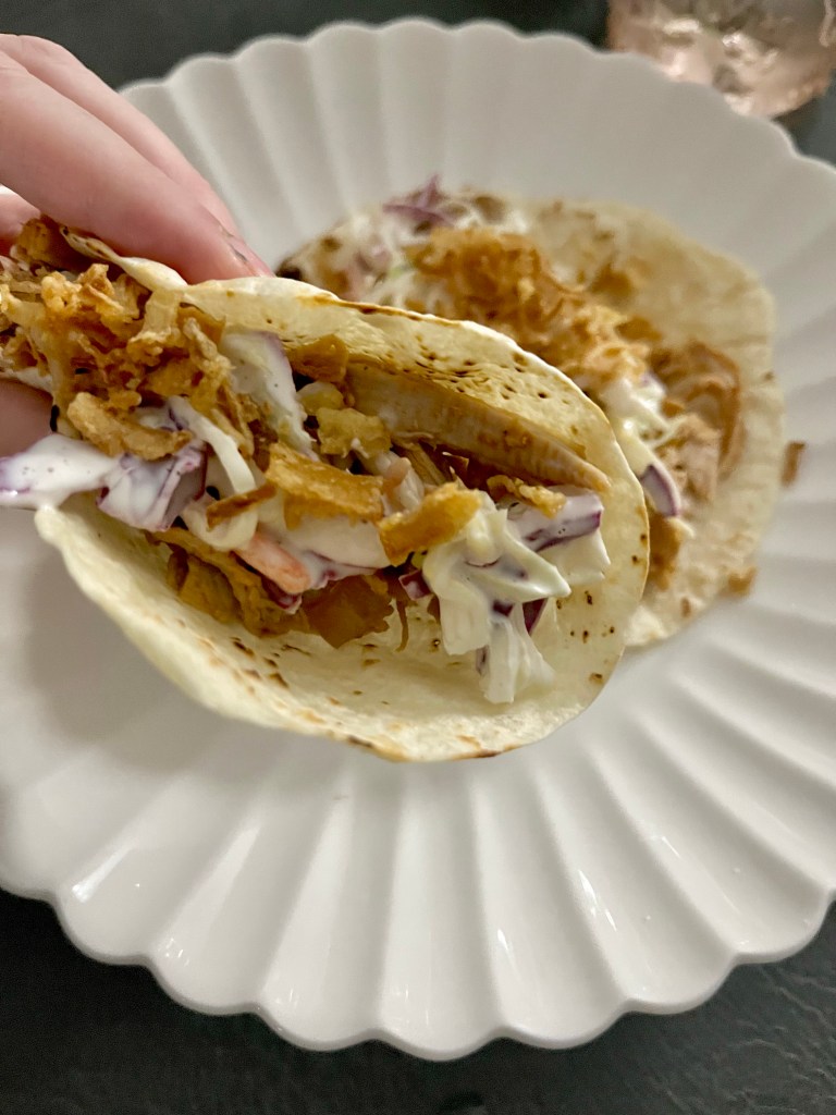 Place one pork tenderloin in a slow cooker and coat with your favorite bbq sauce (I used Johnny Harris). Add 1/2 sliced red onion and 4 cloves of garlic. Set it on high for 4 hours. Next, mix slaw with sour cream, mayo, salt, pepper, and fresh lime. Maybe some paprika but not necessary. Shred the pork, mashing the garlic cloves as you go (they’ll be super soft) and spooning some of the liquid from the crock pot into the mixture til it’s your preferred level of juicy. Serve the pork with the slaw, crispy fried onions (like for casseroles – the crispy jalapeno bits from Trader Joe’s would also be great here), and charred tortillas (I prefer flour tortillas here because it best mimics the toasted white bread used for bbq sandwiches). If you have pickled jalapeños, those would be great on this spread. (I ran out, sad face.)
