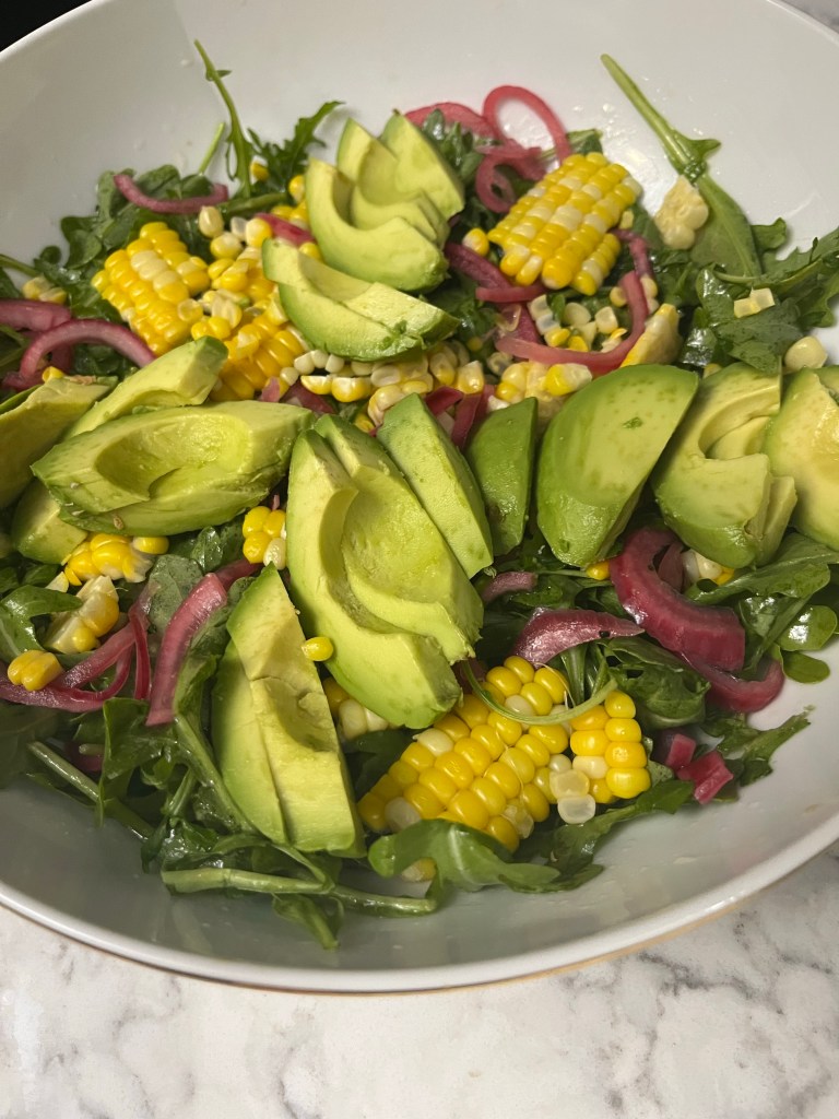 Start by boiling two cobs of corn for 3-5 minutes and then slice the kernals off. To assemble your salad, you’ll need a bed of arugula (the pepperyness of it balances the sweet corn nicely). Top the lettuce with the corn, slices of avocado, and pickled red onion. I like keeping a jar of quick pickled red onion in the fridge for Taco Tuesday. If you don’t already have them – you can easily make them day-of if you just add a little time to this recipe. Finally, make a quick vinaigrette with olive oil, the juice of a lime, a squeeze of honey, and some salt. I actually think I used a jalapeño salt, but if you don’t have that (who would? I’m just lucky to have a Mom who gifted me some) just add some fresh jalapeño to the vinaigrette itself.