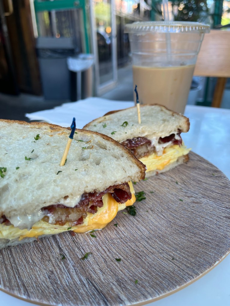 I got an iced latte and it was great. They’ve got a full coffee/tea menu with all the concoctions and serve alcohol if you’re not an early bird. But I think the food menu really sets them apart here. There a pastries, salads, and sandwiches, but I had to get my hands on an egg and cheese. They offer a build-your-own style so I chose sourdough, cheddar, bacon, and jerk mayo. It was perfect.