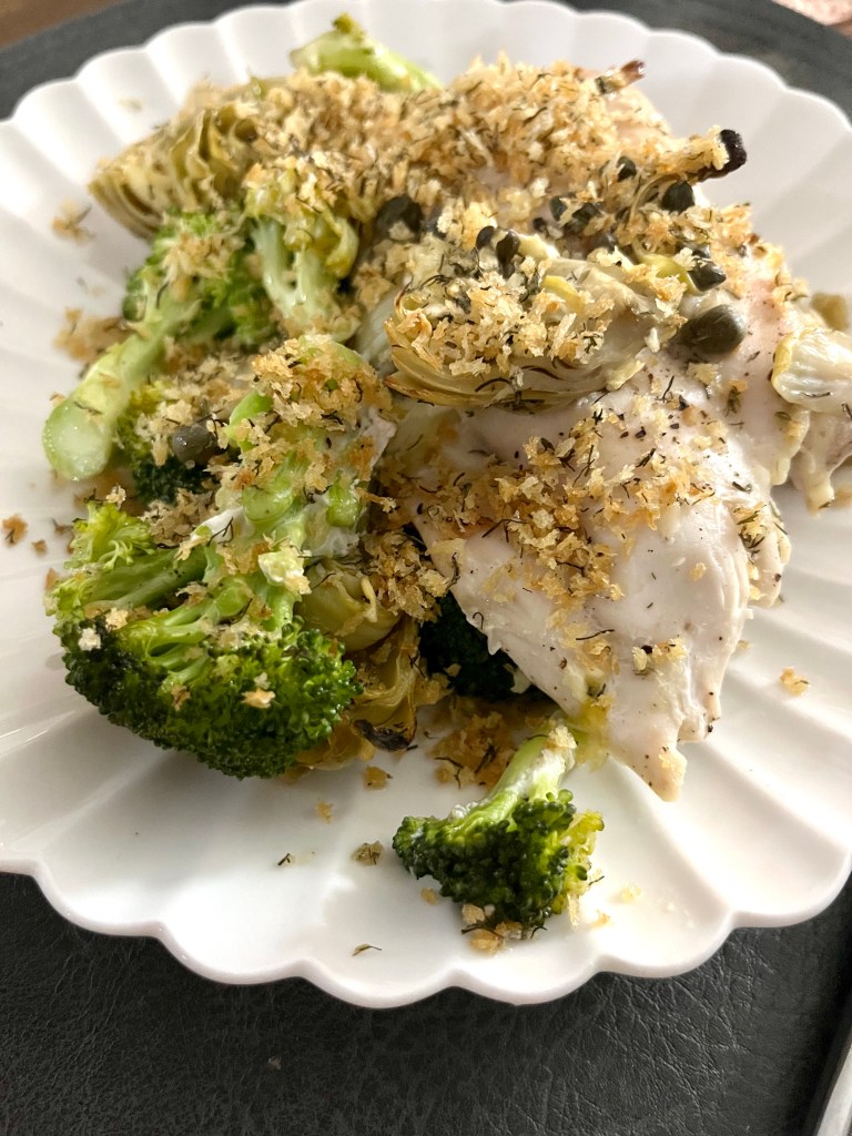 Heat oven to 400 degrees. In a baking dish, combine boneless skinless chicken breasts (1.5-2 lbs), 1 head of broccoli (cut into florets), 2 tbsp oil, salt, and pepper. Layer it in the dish so the chicken is sitting on top of the broc. Separately, in a large bowl, combine ~28 oz artichokes (recipe called for drained canned, I used frozen), 1/2 c. chicken broth, 2 tbsp capers, 2 tbsp butter (melted), 5 cloves of garlic (recipe goes thinly sliced; I went minced), 2 tbsp oil , and salt/pepper. Toss the artichoke mixture and then spoon over the chicken and broccoli. Bake 30-35 min until the chicken is fully cooked. Meanwhile, in a small skillet, brown 1/2 c. panko in 1 tbsp oil over low heat until they’re nice and golden (8-10 min). Transfer the bread crumbs to a bowl to cool, stir in 2 tbsp dill, and salt/pepper. When the casserole comes out of the oven, squeeze lemon all over the top and sprinkle the dill bread crumbs over everything.