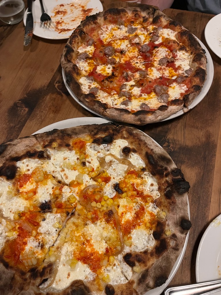 Then for the pizzas, we got three to share between the four of us. We ordered the Santo (sausage, onions, and chili oil), a margarita (because the waitress stressed that, though simple, the ingredients were top notch – not wrong), and the corn. The corn is the pizza we’d been hearing all about. It has fresh mozz, shaved onion, chili paste, and, of course, corn. It was sweet and summery and delicious. It would never be the pizza I’d gravitate toward, but it was wonderful.