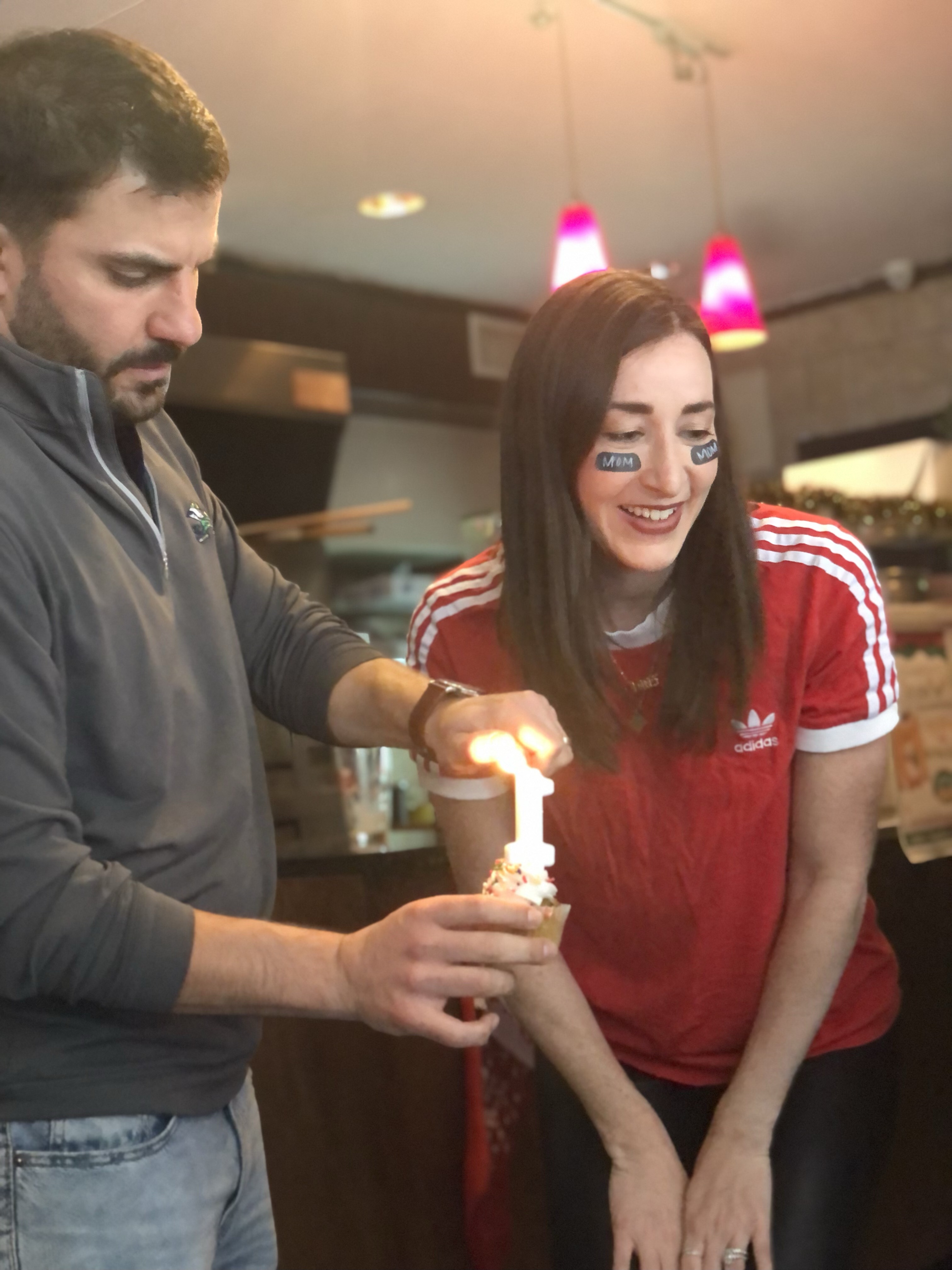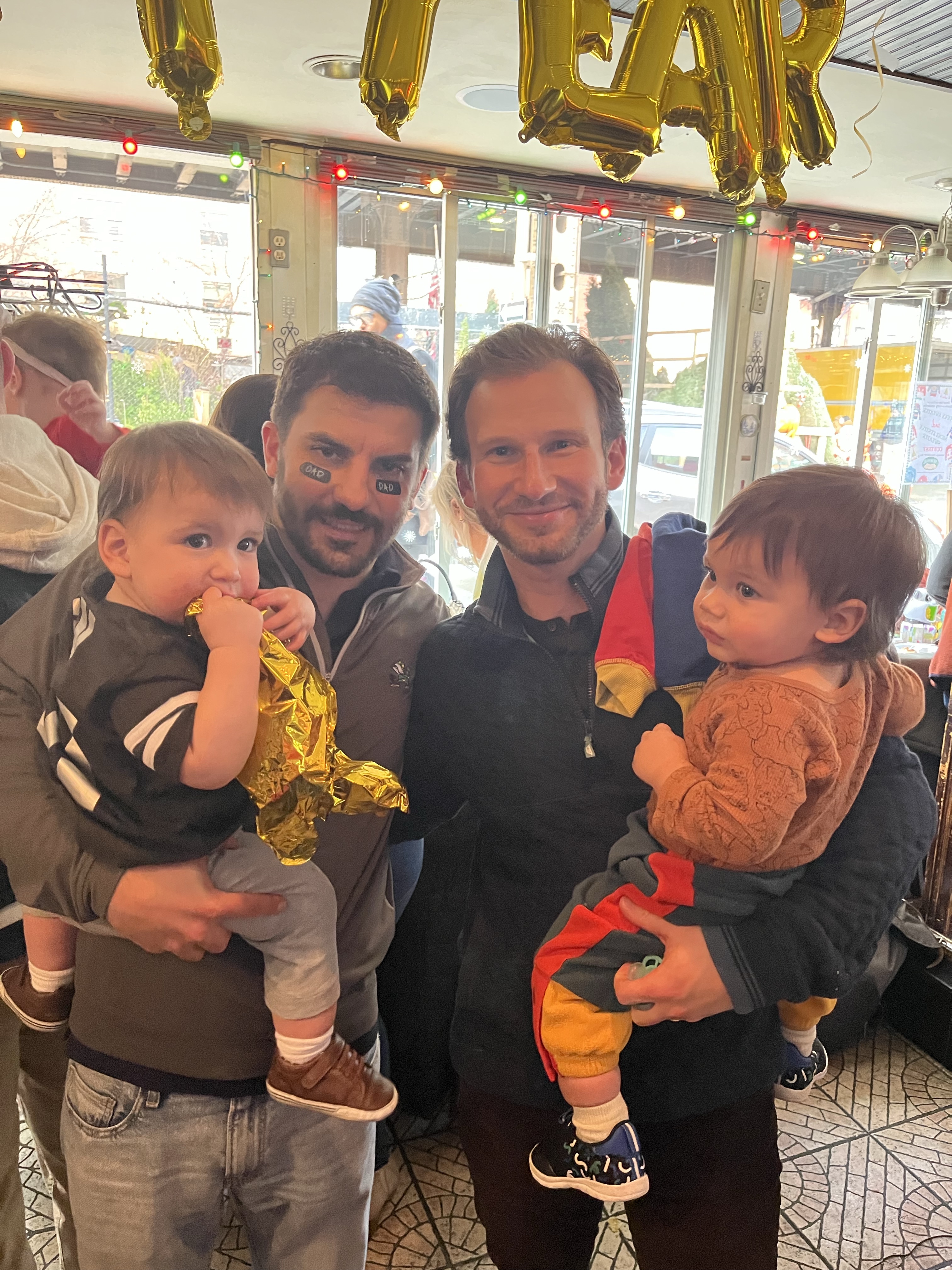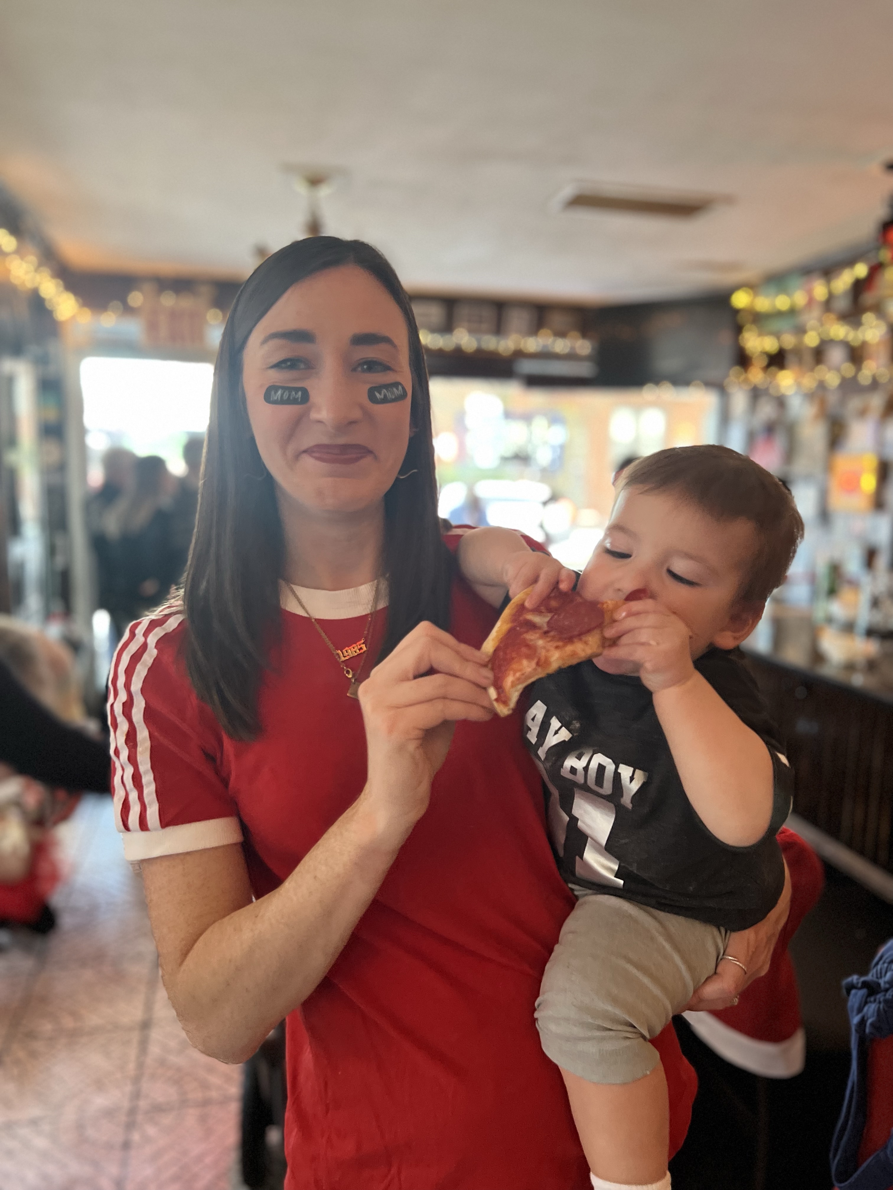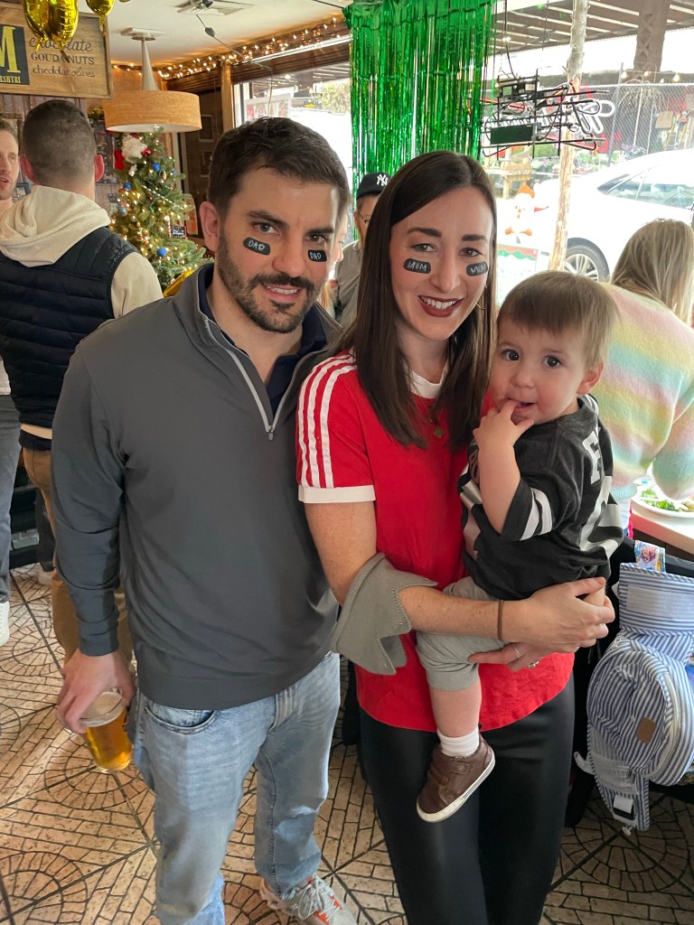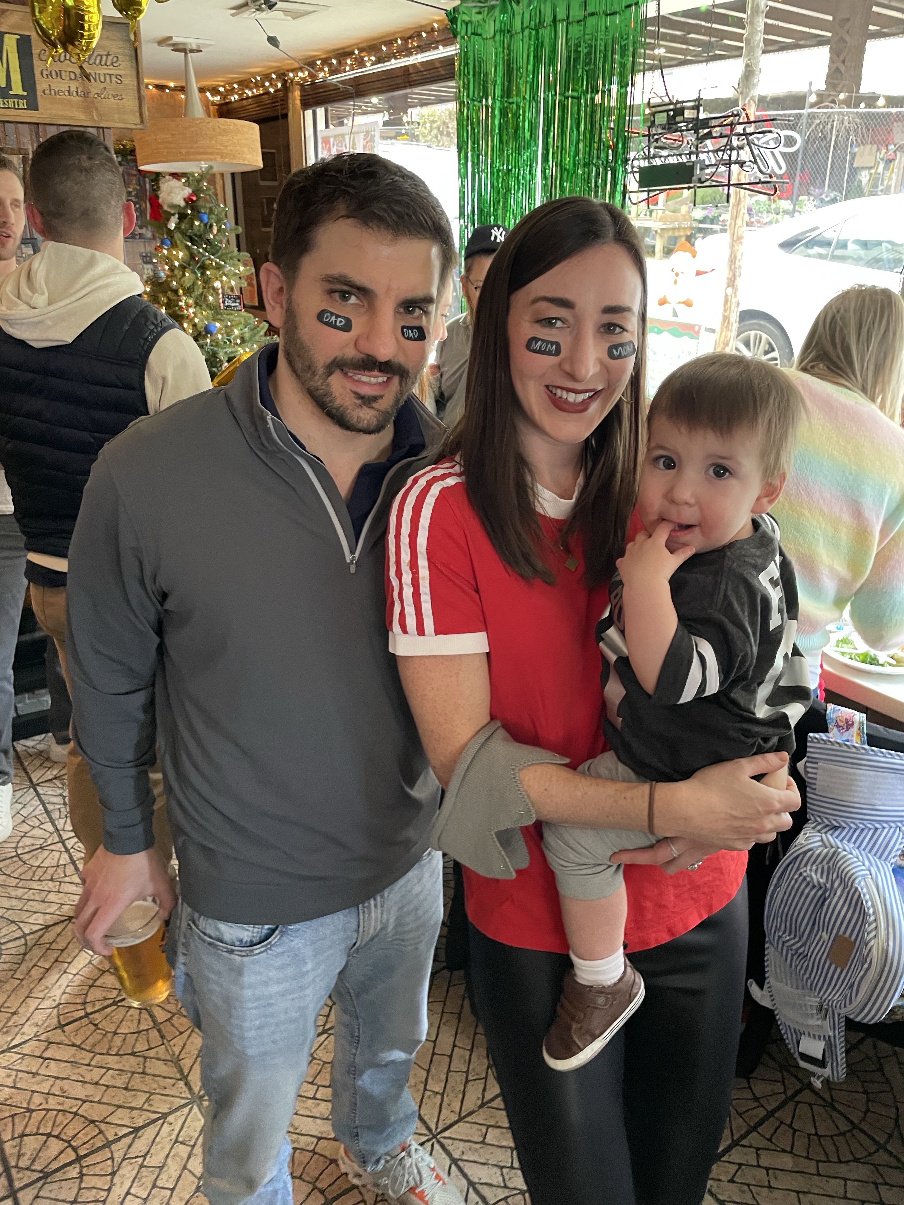 - The Outfits: We didn’t encourage anyone to dress on-theme, but we had to do a lil something extra as the bday fam. Finn wore a crown and a custom jersey that said BDAY BOY on the front and FINN on the back with the number 01. We wore sporty stuff and Mom/Dad eye blacks. We also had eye black stickers for all the guests so they could customize and get festive too.