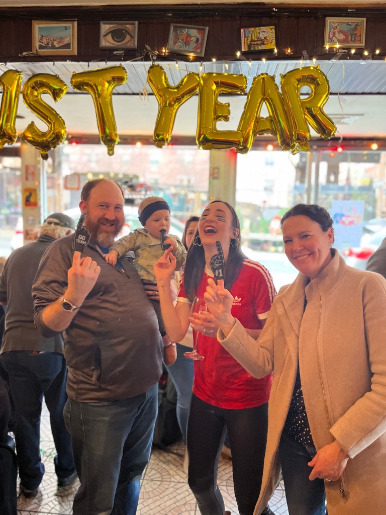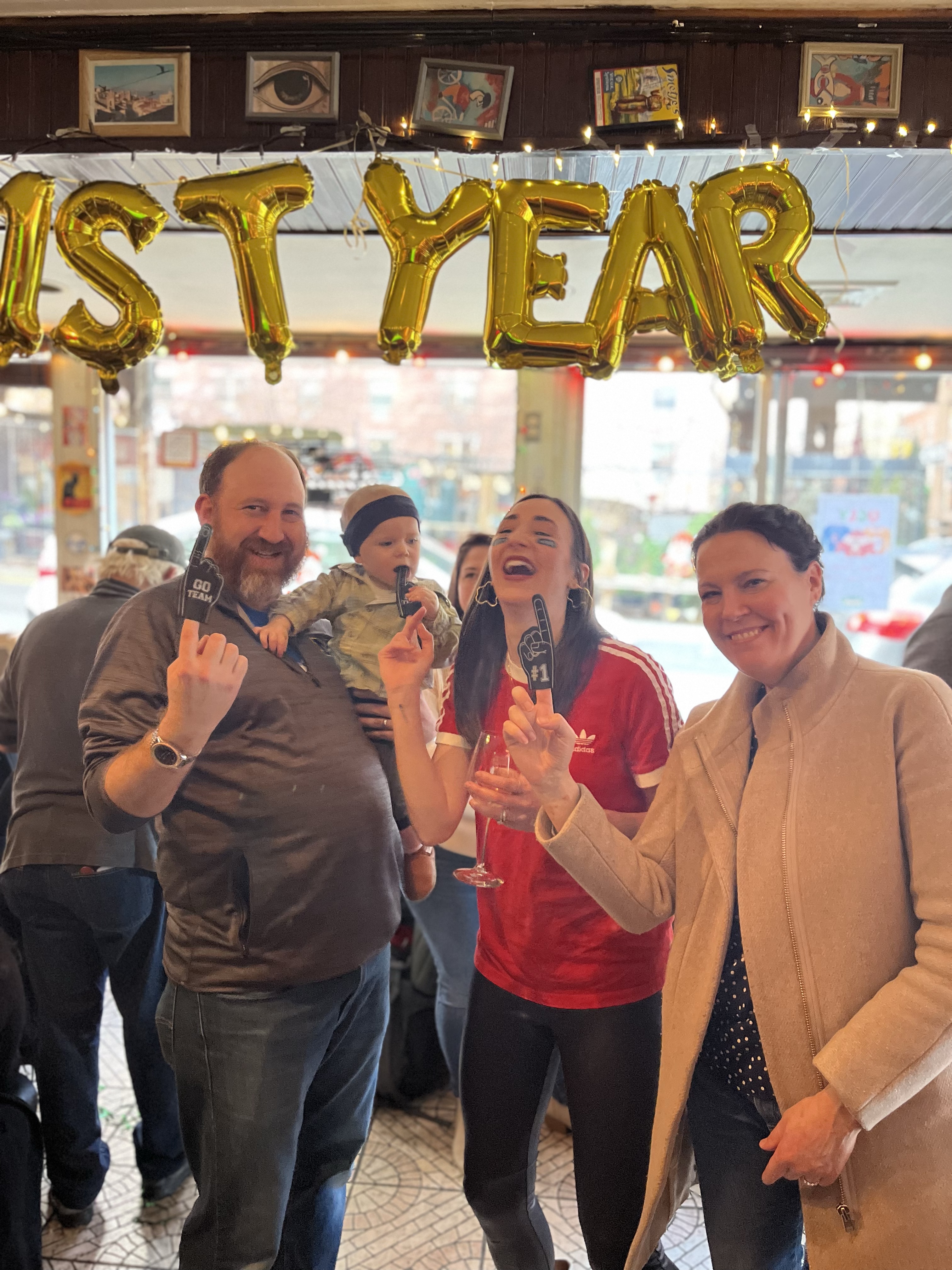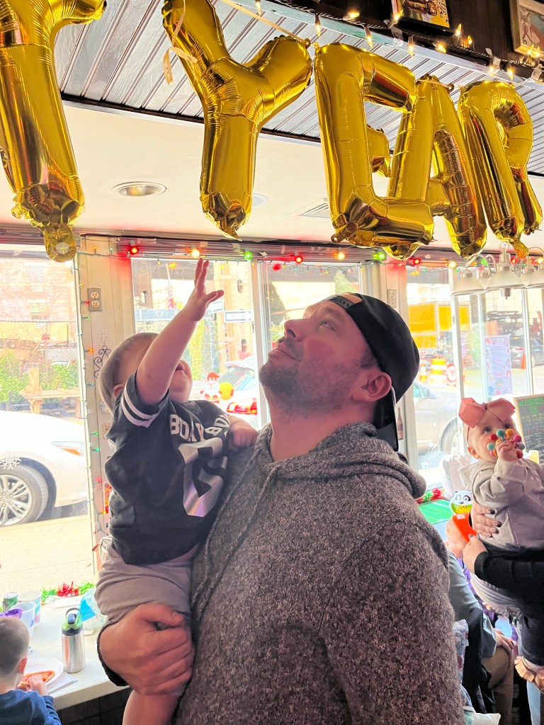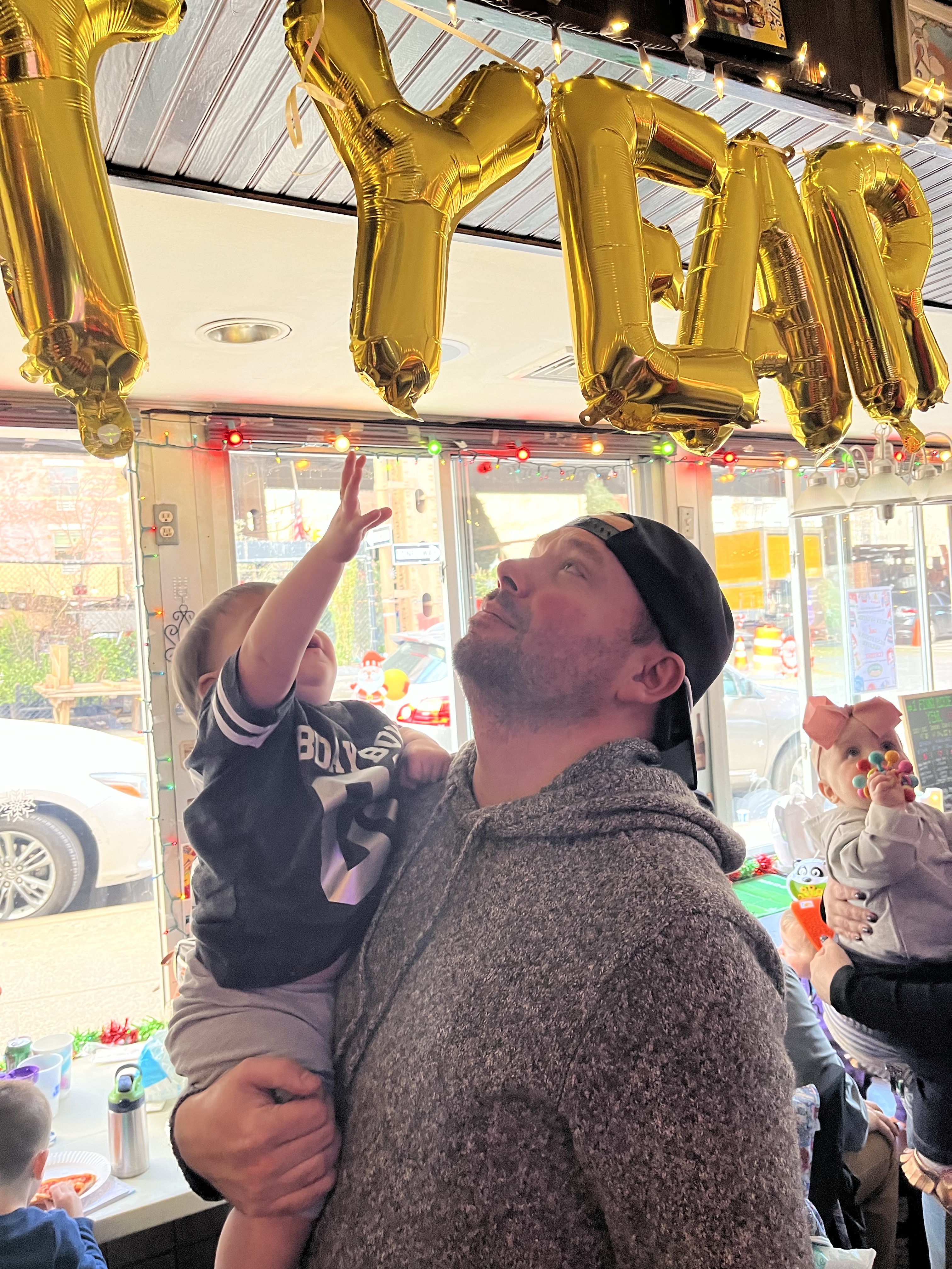 We held the party at a pizza place at the end of our block and invited Finn’s classmates and our family/friends. It’s wild how quickly that guest list grows! Each kid/friend comes as a packaged deal. Because they’re just babies, one RSVP from Finn’s school buddy means three or four people (the kid plus parents and maybe a sibling) and many of our friends are married with kids so they show up as a family of four. 25 invites turned into 65 people, which seems kinda nuts. About 50 people ended up showing up, but it actually didn’t stress me out – it actually made me so happy to have so many people who care about Finn and want to celebrate him.