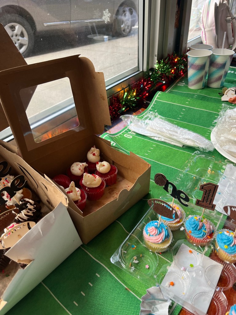 - The Decor: We had a balloon banner that said “First Year Down,” a photo banner with a pic for each month, a football-themed high chair banner, field table runner, themed cupcake toppers, mini foam fingers, and a homemade milestone chalkboard sign.