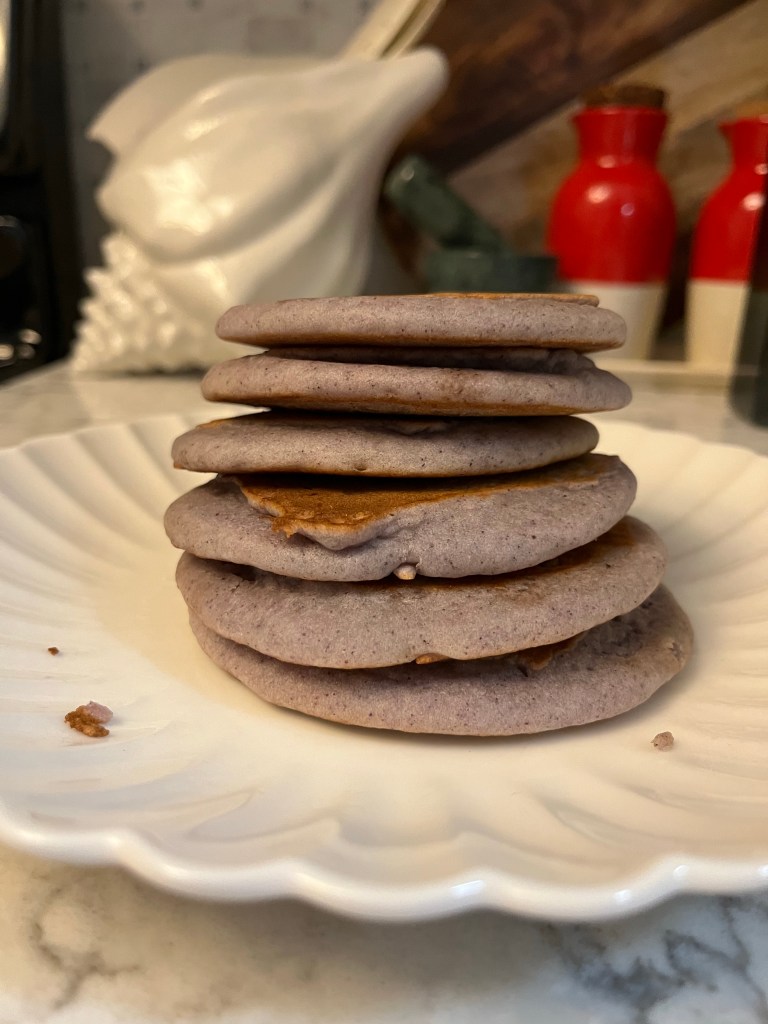 I made pancakes for the first time…maybe ever? It w meant I finally got to whip out the electric griddle we got for our wedding and this nonstick masterpiece worked like magic. I used the ube mochi mix from TJ’s (hence the purple hue) and they came out perfectly in under 10 minutes. (Quite tasty too.) It was nice to have a special holiday breakfast to set the day apart.
