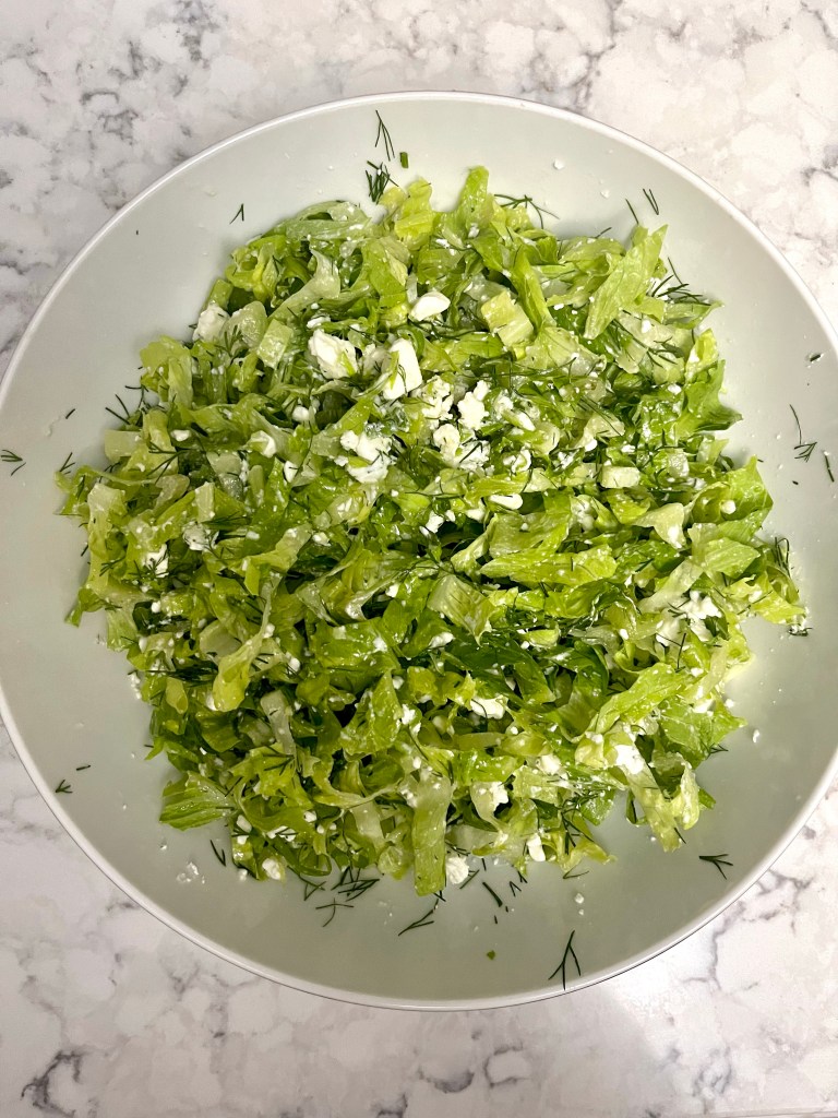 I followed this recipe and it comes together in just a few quick minutes. Start by thinly slicing two hearts of romaine into ribbons and make sure it’s dry. In your serving bowl, whisk together 1/2 c. olive oil, the juice of one lemon, and 1/4 tsp salt. To the serving bowl, add the lettuce, 4-5 chopped scallions, 1/2 block of [good] feta (crumbled), and 1 bunch of fresh dill (chopped). Toss to coat with the dressing and enjoy.