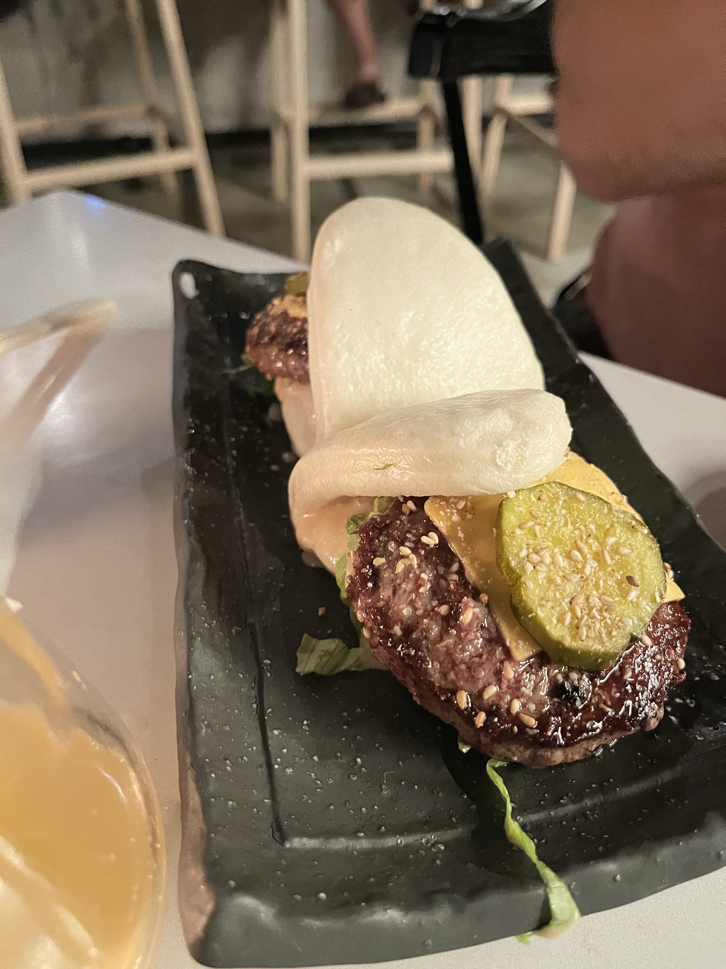 The space, like the food, is a juxtaposition of cultures. Concrete floors with a natural branch overhead; tonkatsu alongside cheeseburger buns. The kitchen is open and the vibe is convivial.