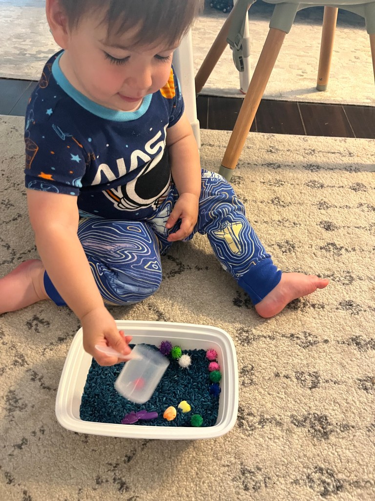 The weather’s been pretty dreary lately so I was thankful to have my Learning with Kelsey box handy for some indoor activities this weekend. This under-the-sea mini sensory bin occupied Finn for a solid half hour.