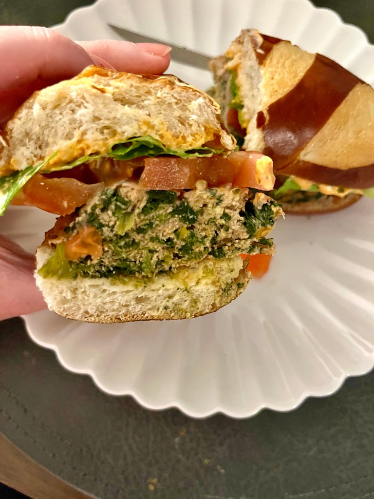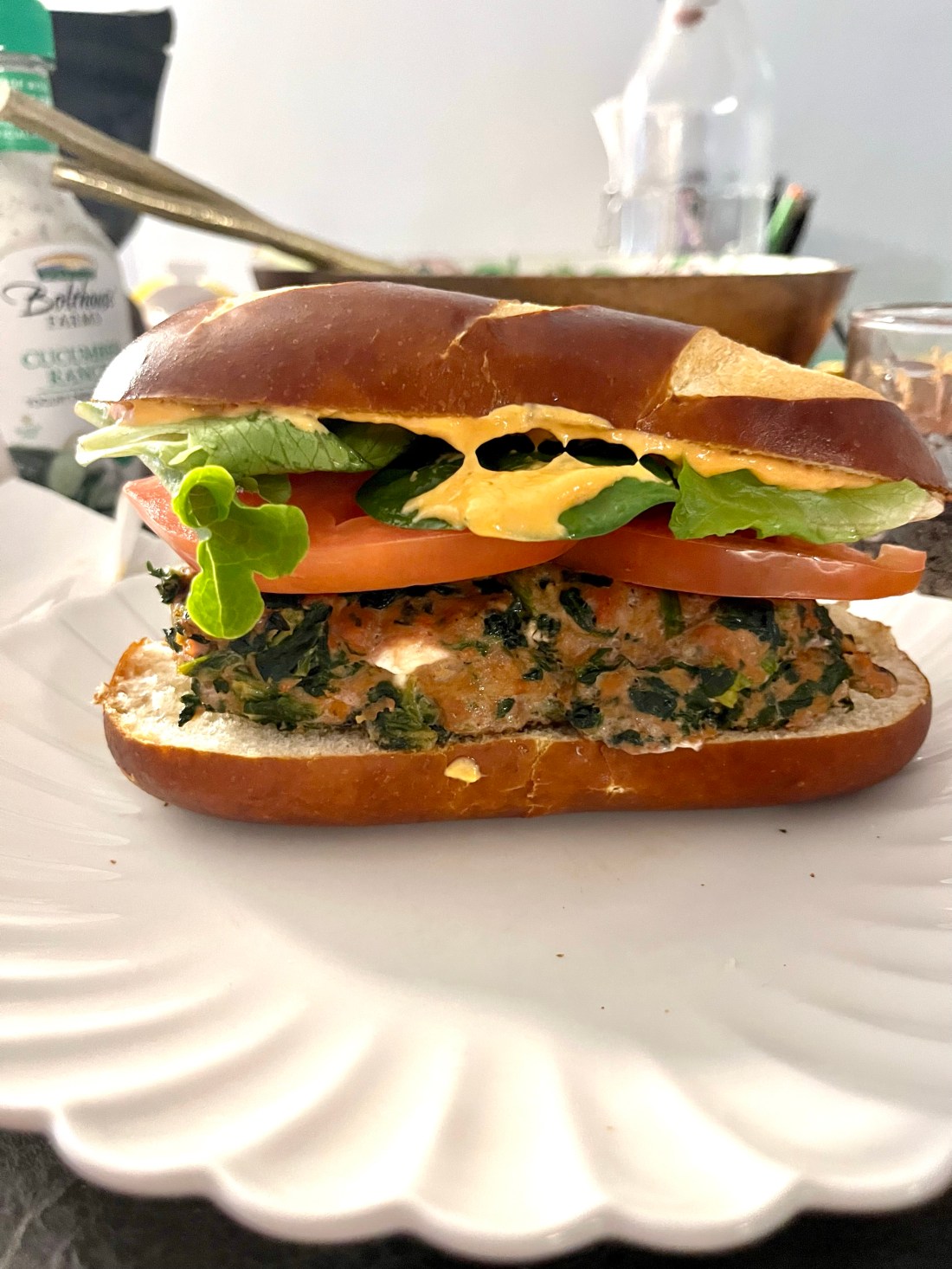 In a bowl, mix 1 lb ground turkey, 1/2 package of thawed and drained chopped spinach, 2 oz crumbled goat cheese, 1 tbsp red pesto, and seasoning (I don’t remember but assuming I sprinkled garlic, salt, paprika, and oregano in there). Cook at 400 (on a silpat) for about 20 minutes. Assemble on a pretzel bun with lettuce, tomato, and some red pesto mayo (made by simply mixing some of that red pesto into mayo.