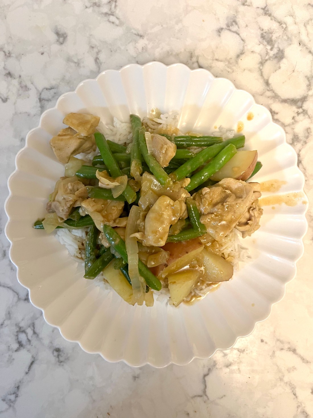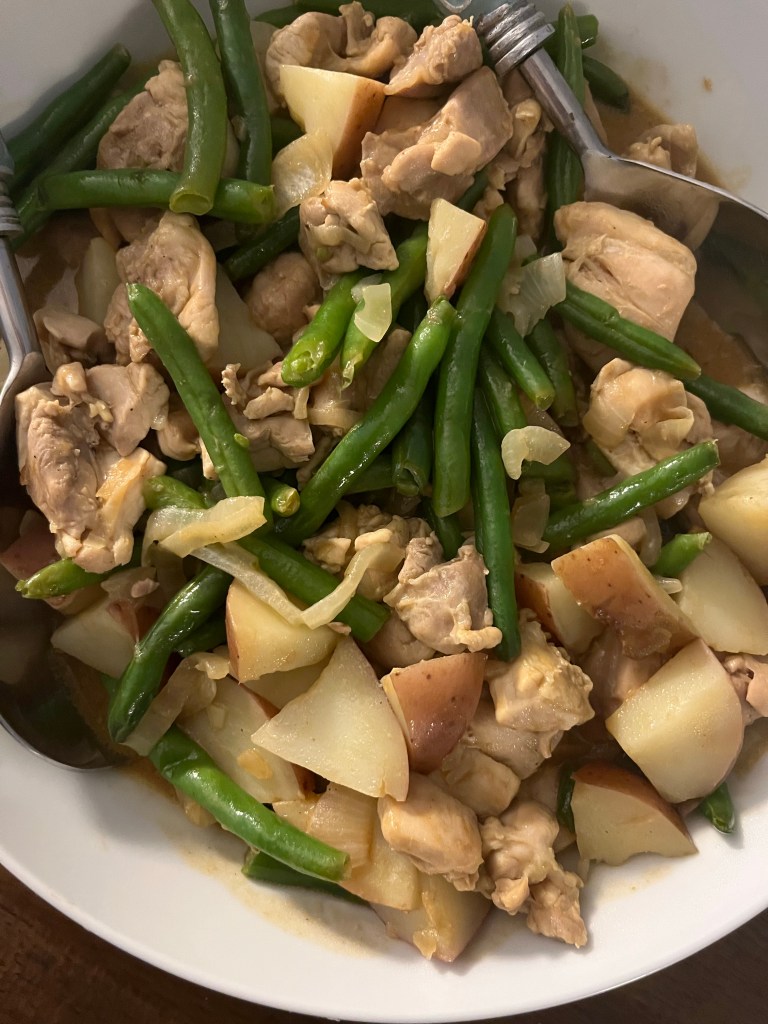 Start by sautéing sliced onion until soft. Add boneless skinless chicken breasts (cut into 1-inch chunks) and brown. (Boneless skinless thighs would be great here too.) When the chicken is browned, add your kare kare simmer sauce and some salt and let go for a bit. Meanwhile, boil 2 red potatoes until fork tender and microwave a package of fresh green beans. Serve over rice.
