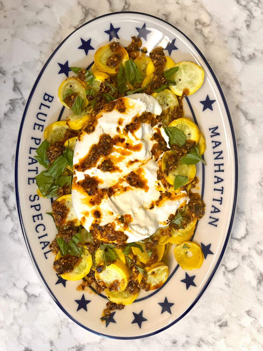 The original recipe has you making chili oil. That’s great. I, however, took the easy way out and used storebought stuff. If you do that, basically all you have to do is sauté sliced yellow squash in some olive oil with salt and pepper. Once it’s softened, spread out on a plate, top with torn basil, and then plop a whole ass burrata on top. Drizzle your fave chili crisp over the whole think then cut open that burrata and let it ooze, baby. It’ll all meld together into pure deliciousness.